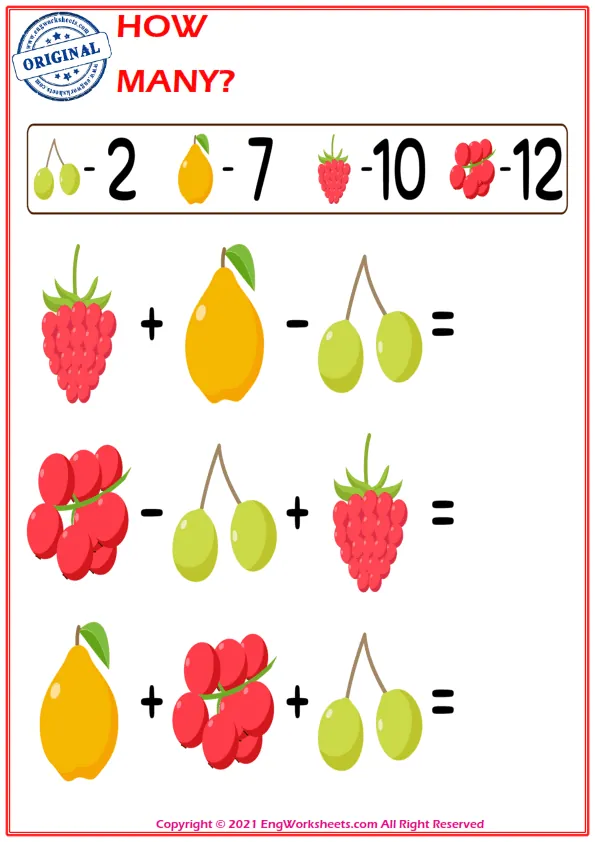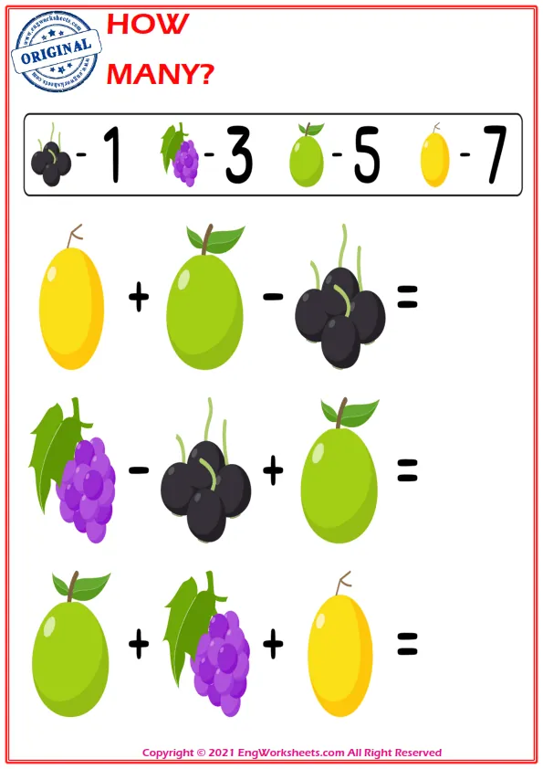 The most practical way to learn to do math operations. Perform the math operations according to the values given to the fruits on the worksheet. You can use the addition and subtraction worksheet at school or at home. The PDF worksheet is a good resource for elementary school children. The PDF worksheet can be printed for free. Please click on the link to download the free printable worksheet. You can download the PDF file and print the worksheet.