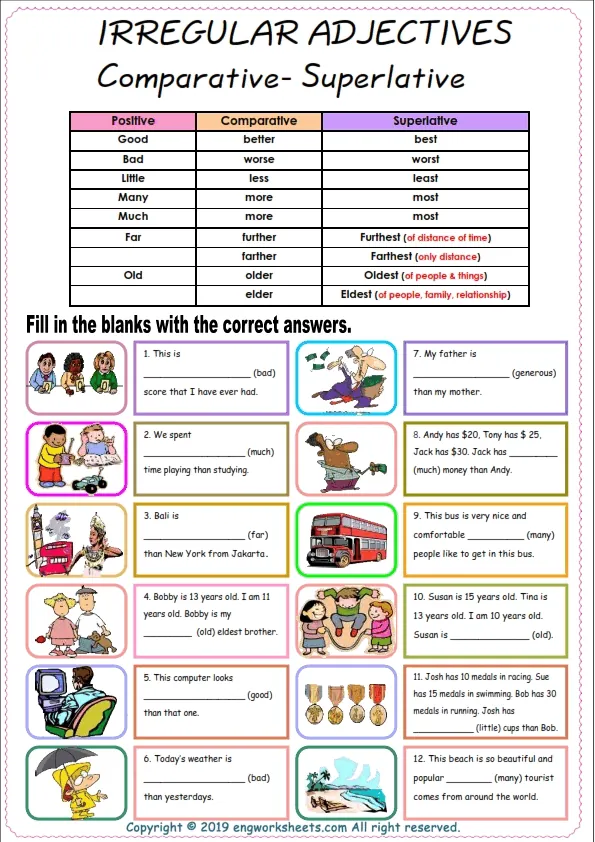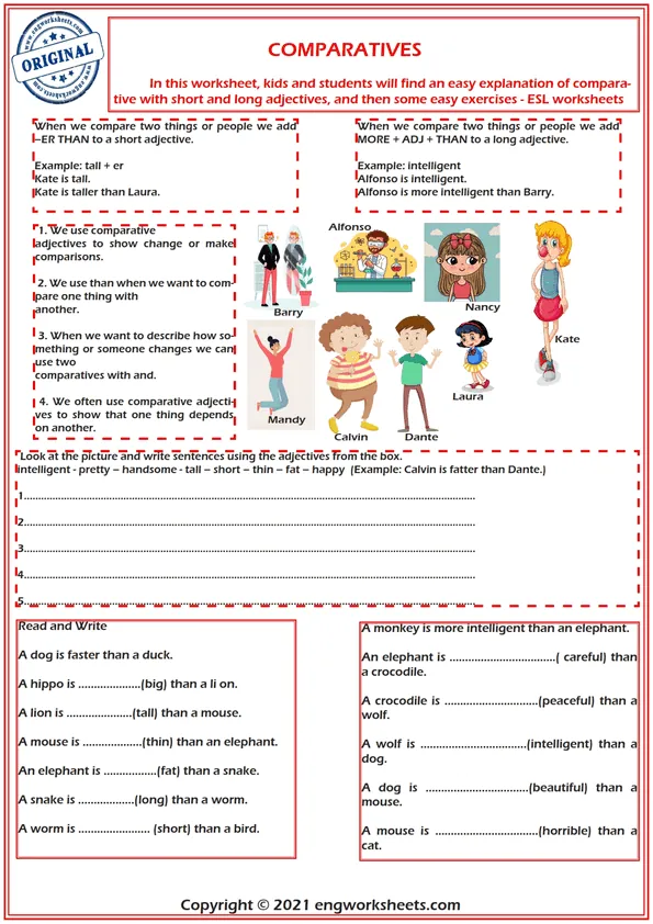 Comparatives Esl Printable Gap Fill Exercises Quiz For Kids And Students An Enjoyable Esl Printable Gap-Fill Exercises Quiz For Kids And Students To Study And Review Comparative Forms Of Adjectives. Look At The Pictures, Fill In The Blanks With The Correct Comparative Forms Of The Adjectives To Complete The Sentences. In This Worksheet, Kids And Students Will Find An Easy Explanation Of Comparative With Short And Long Adjectives, And Then Some Easy Exercises - Esl Worksheets It Is Great For Teaching Adjectives In English And Can Be Used For Strengthening Your Students' Writing Skills. Comparative And Superlative Exercises. Comparatives And Superlatives. Comparatives Exercises. Comparatives Examples. Sentences With Comparative Adjectives. Comparatives Adjectives. Comparatives Grammar Worksheets.
