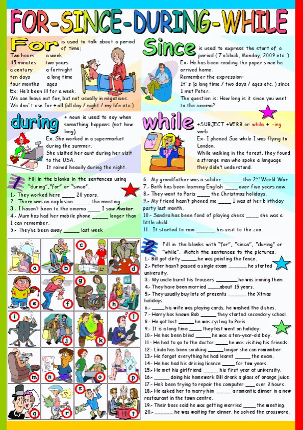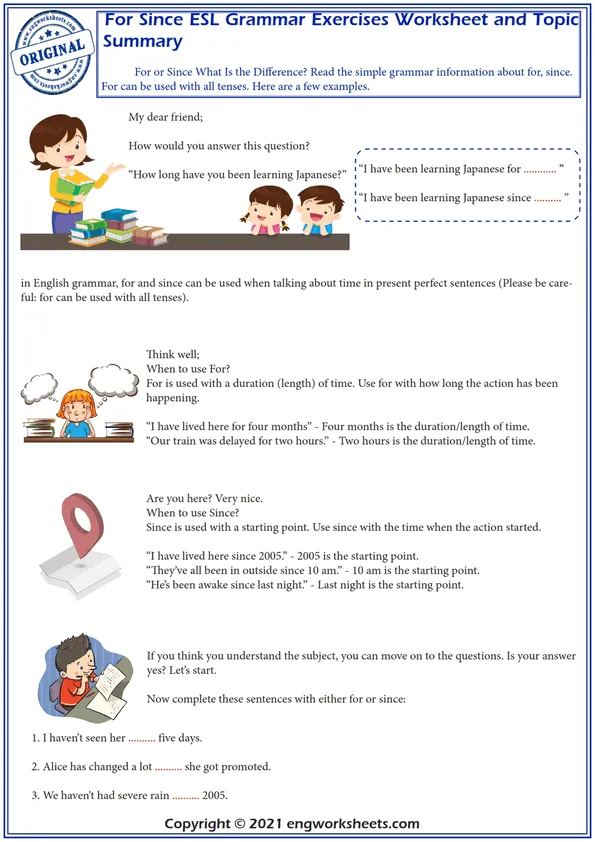 For-Since English worksheets typically include exercises that require learners to fill in the blanks with the appropriate preposition in a given sentence. The exercises may also include questions that require learners to use the prepositions in context, such as asking about the length of time a person has been doing a certain activity or the starting point of an event.