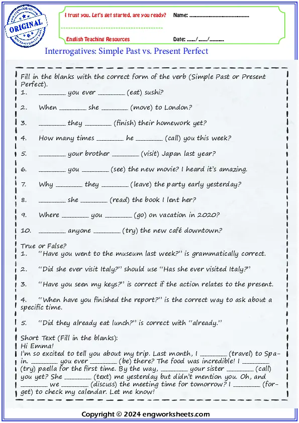 Free ESL Printable Interrogatives English Grammar Worksheet