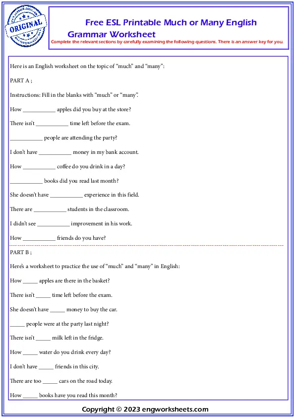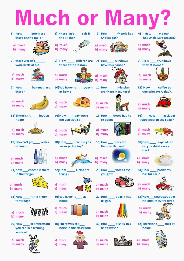 Master the usage of quantifiers with our "Free ESL Printable Much or Many English Grammar Worksheet". Perfect for ESL students, this worksheet provides clear explanations and engaging exercises to help learners distinguish between "much" and "many". Ideal for classroom use or self-study, our high-quality, printable worksheet is designed to enhance your understanding of English grammar. Download now to improve your skills and gain confidence in using these common quantifiers correctly. Whether you're a teacher or a student, this resource is a valuable addition to your learning toolkit. Get your free worksheet today and start mastering English quantifiers! Keywords: Free ESL Printable Much or Many Worksheet, English Grammar Much or Many Worksheet, ESL Quantifiers Exercises, Printable Grammar Worksheet, Much vs. Many Practice for ESL Students Search Phrases: Free ESL much or many worksheet, Printable English grammar worksheets for much and many, Much or many exercises for ESL learners, Download free ESL quantifiers worksheets, Best ESL printable resources for much or many
