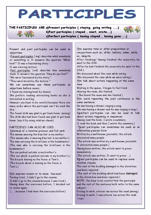 A participles English worksheet typically includes exercises that require students to identify and use participles correctly. For example, students may be asked to complete sentences using the correct participle form, or to identify the participle in a given sentence and explain its function.
