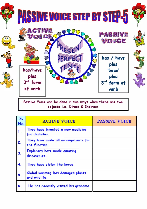 A Passive Voice English worksheet typically includes a variety of exercises that allow students to practice using the passive voice correctly. This may include rewriting active sentences into passive sentences, identifying the subject and object in passive sentences, and choosing the correct form of the verb "to be" and the past participle.