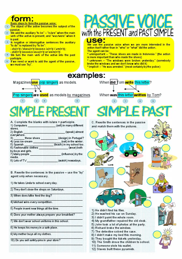 A Passive Voice English worksheet is a tool used to practice and improve understanding of the passive voice in English. The passive voice is used when the focus is on the action being done rather than the person or thing doing the action. In a passive sentence, the subject receives the action instead of performing the action.