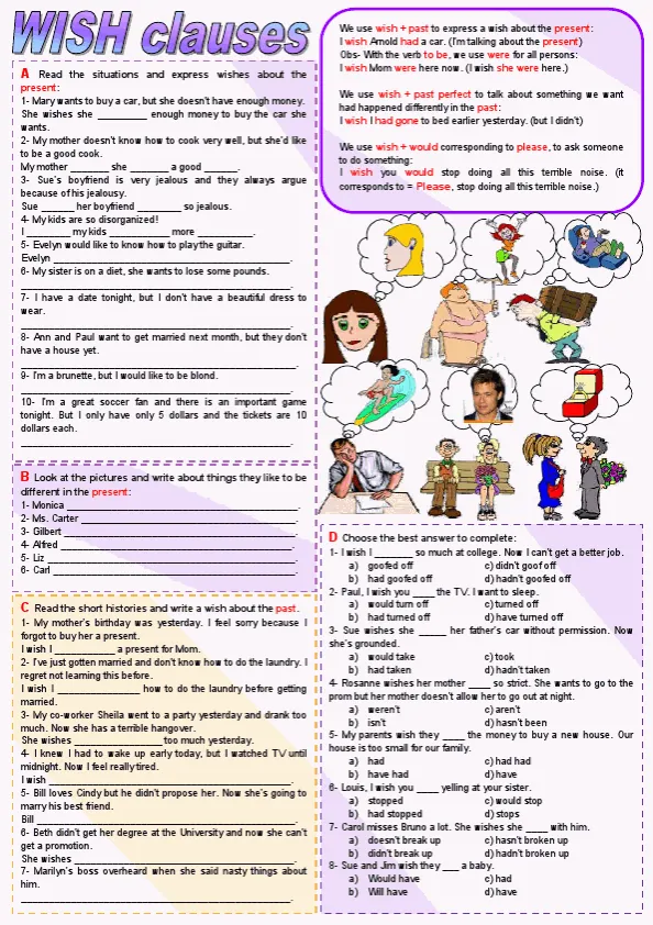 Using a wish clauses English worksheet can be a helpful way for English language learners to practice using wish clauses in different contexts. Worksheets can include exercises such as completing sentences using wish clauses, rewriting sentences to include wish clauses, or identifying wish clauses in a passage.
