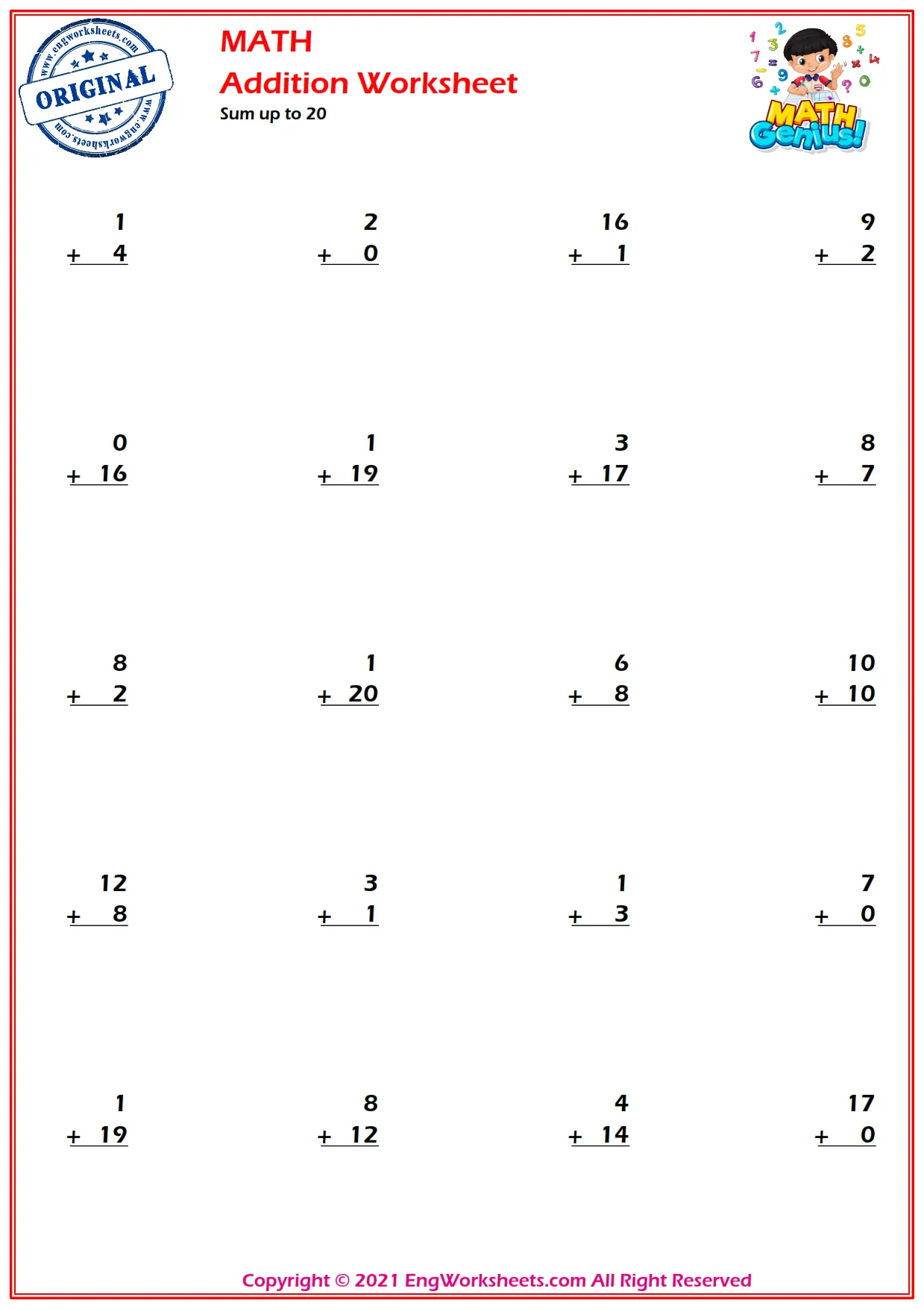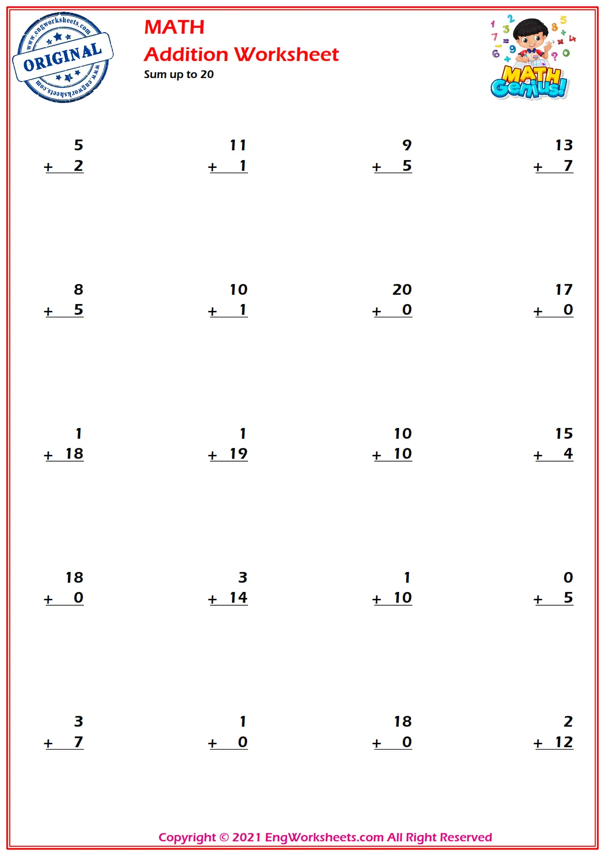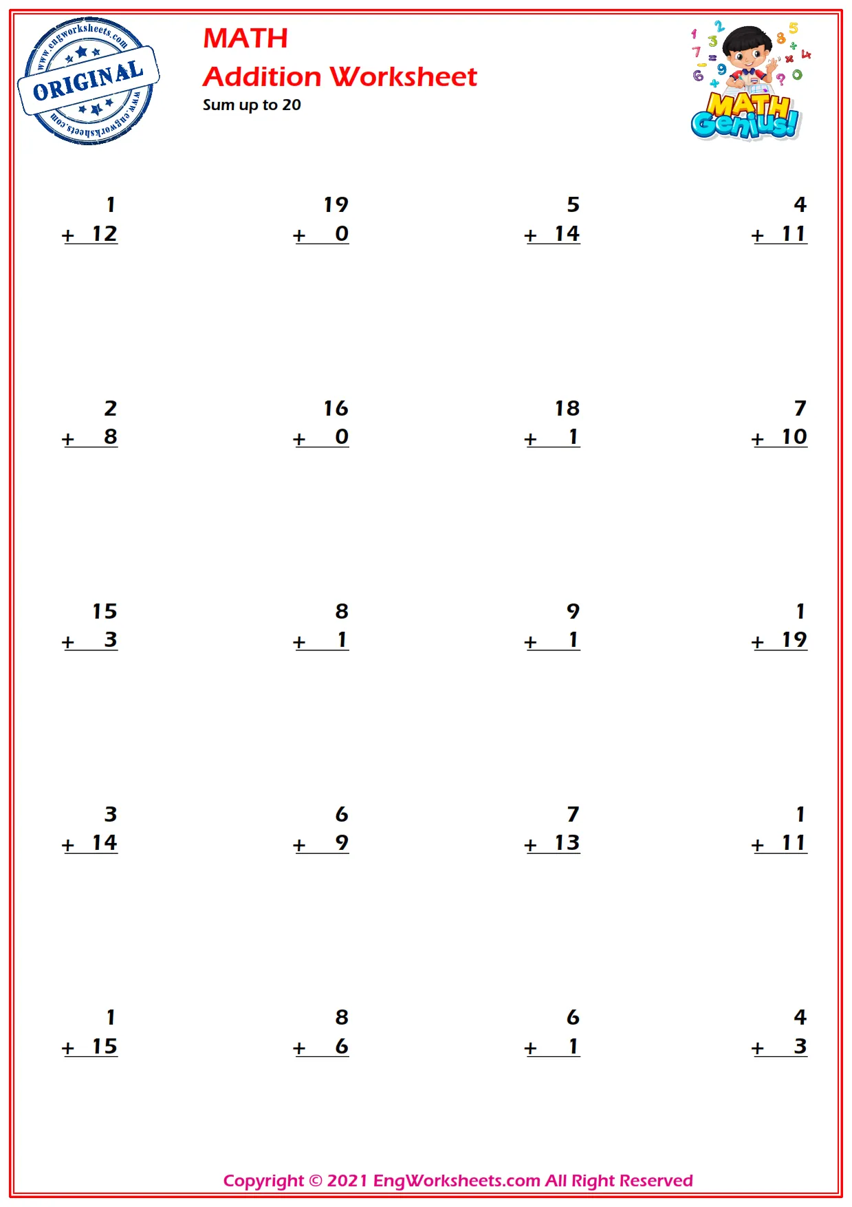 Practice Two-Digit Plus Single-Digit Addition with Printable Worksheets for 1st Grade Our printable worksheets for 1st grade offer a fun and engaging way to practice two-digit plus single-digit addition. With a range of equations that add up to 20, your students will develop their addition skills and build confidence. With our colorful designs and engaging themes, young learners will enjoy practicing their math skills.