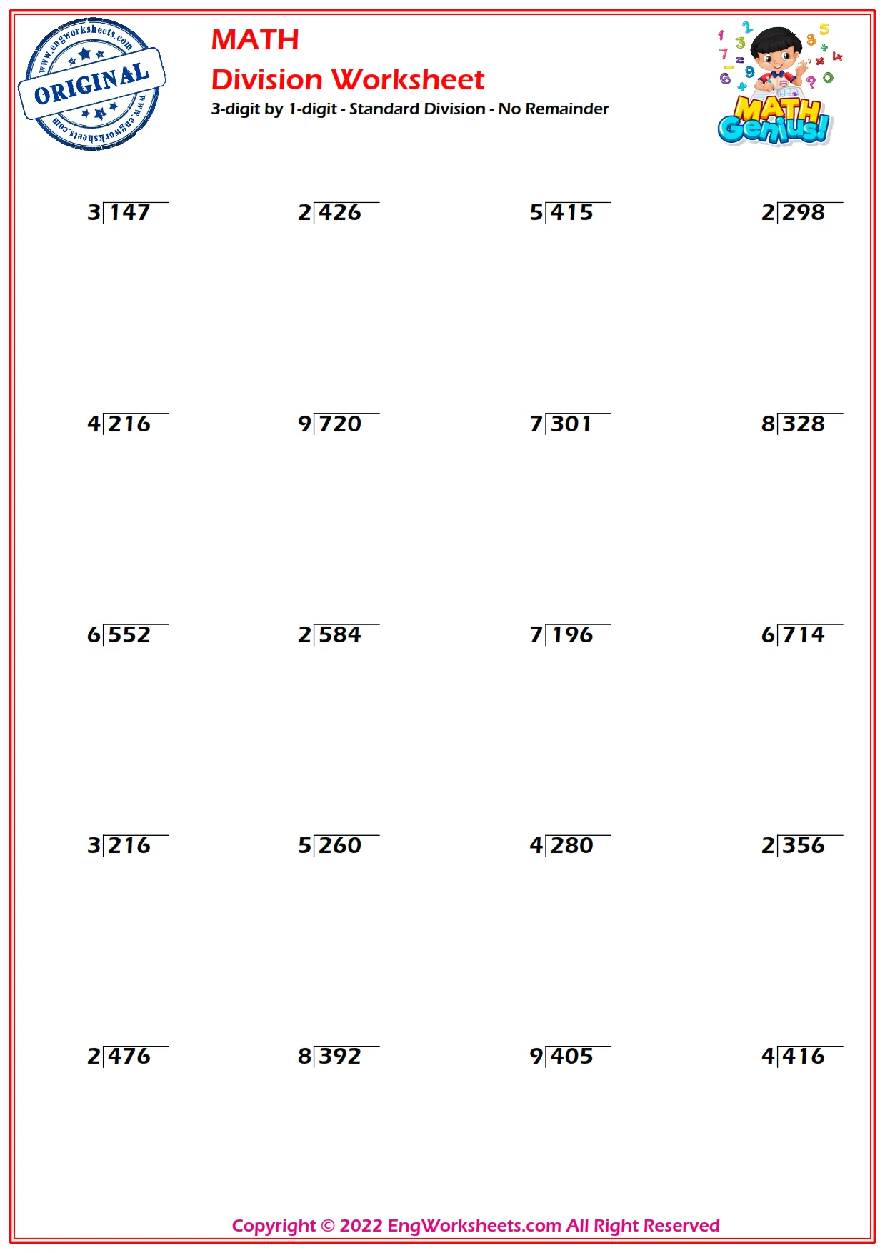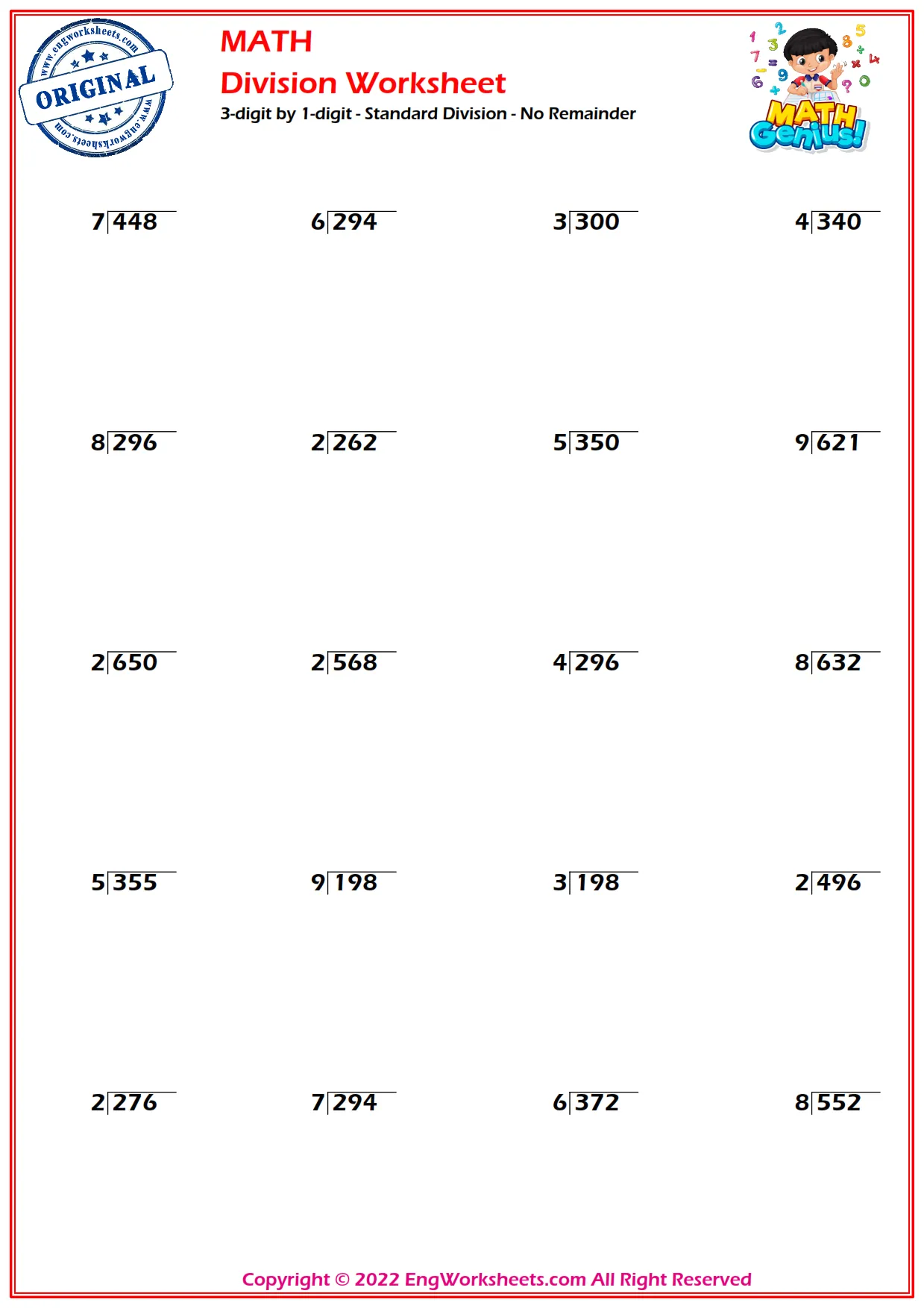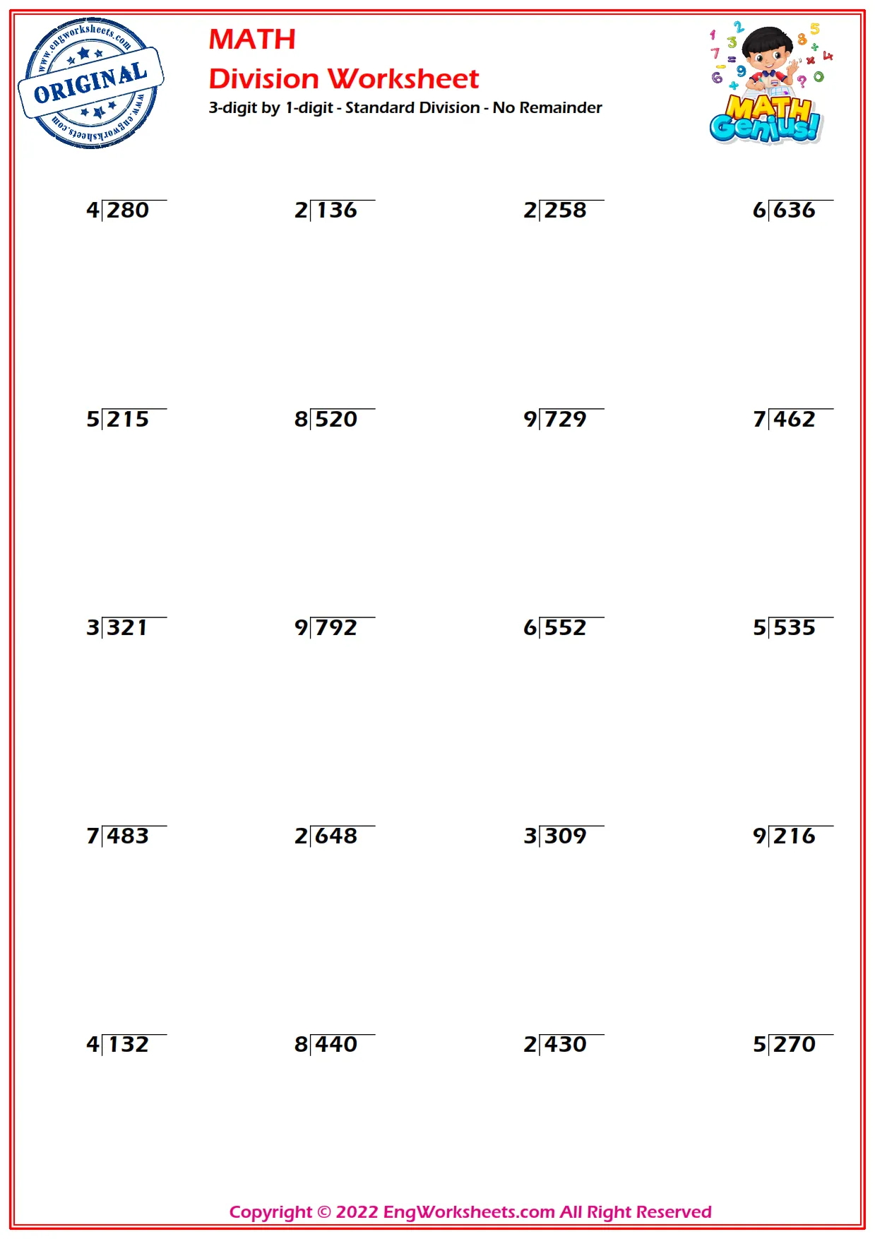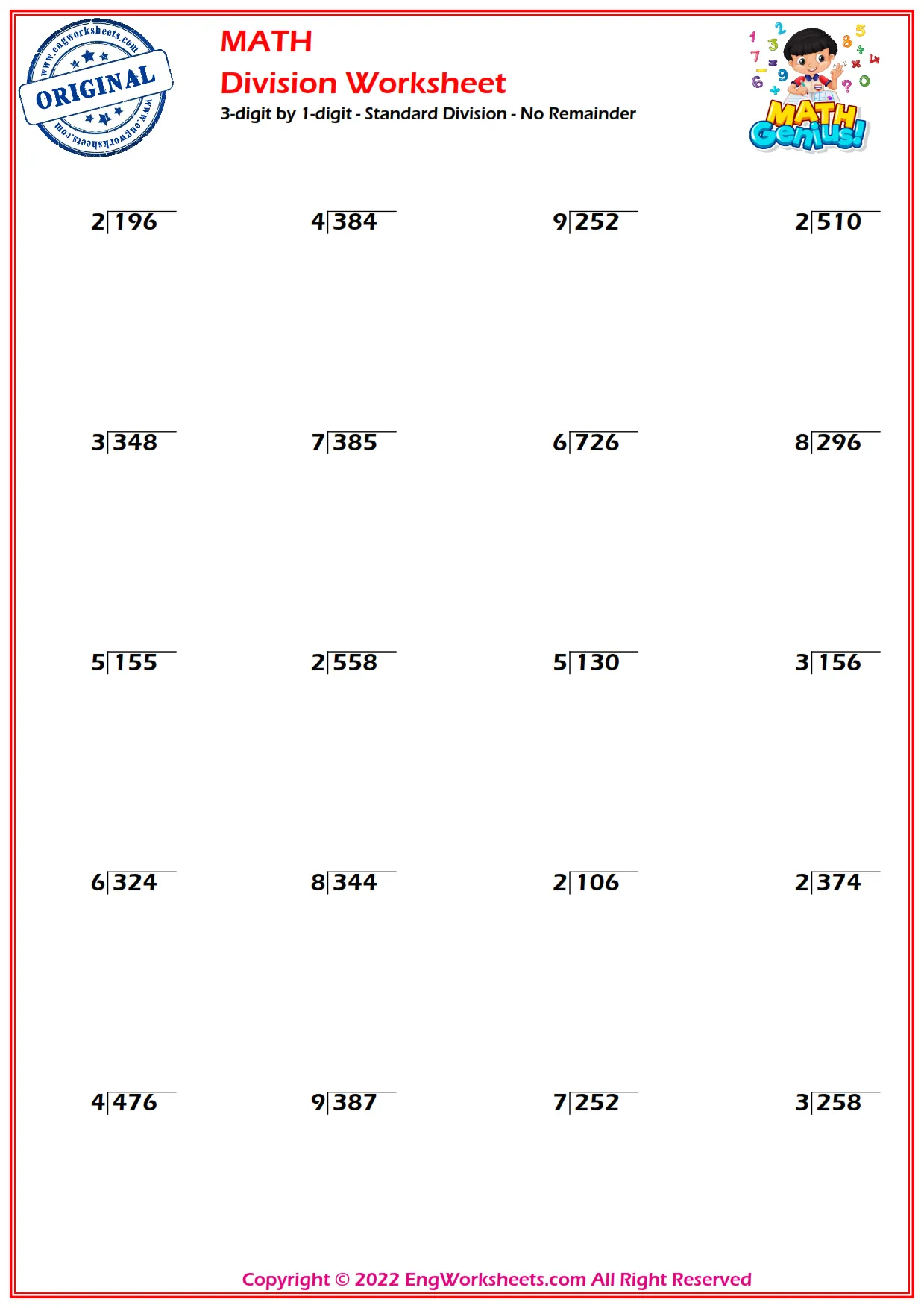 Our printable worksheets on 3-digit by 1-digit standard division problems without remainder are perfect for giving your child a solid math practice. Try them out now and see the results!