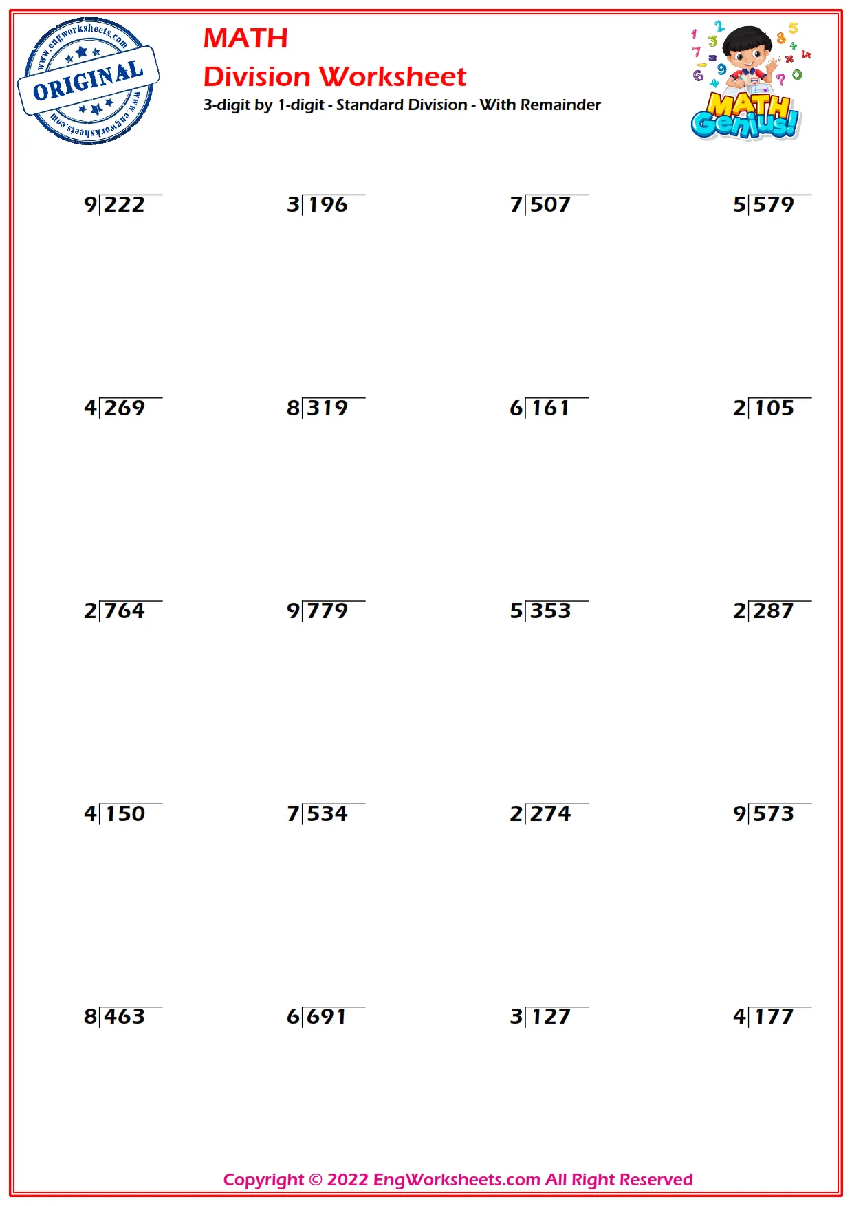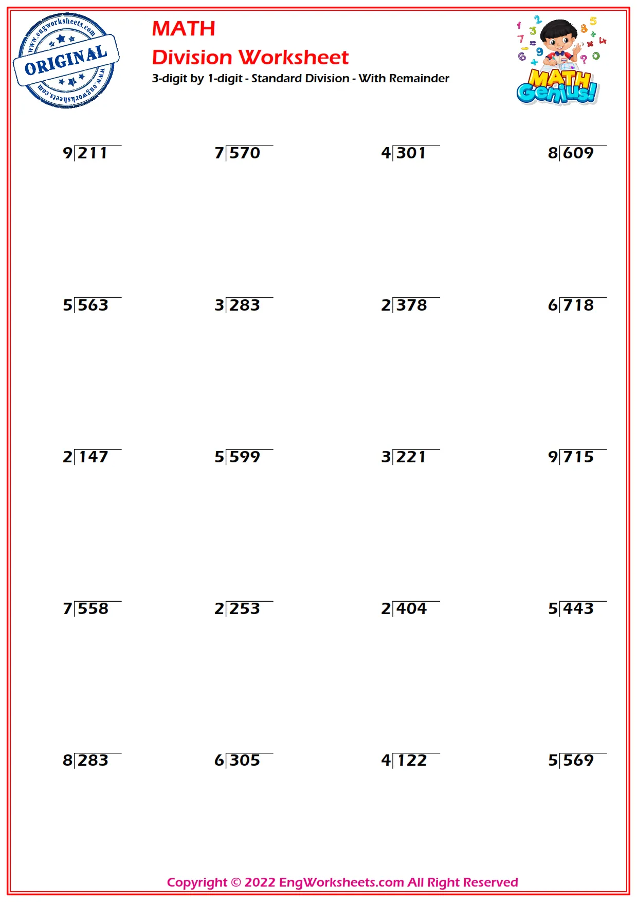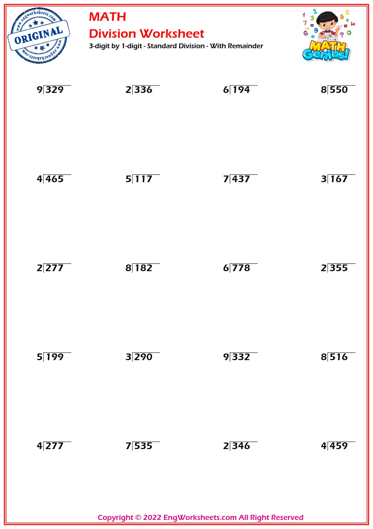 This mixed review worksheet focuses on 3-digit by 1-digit standard division problems with and without remainders. Improve your division skills by practicing with a variety of problems.
