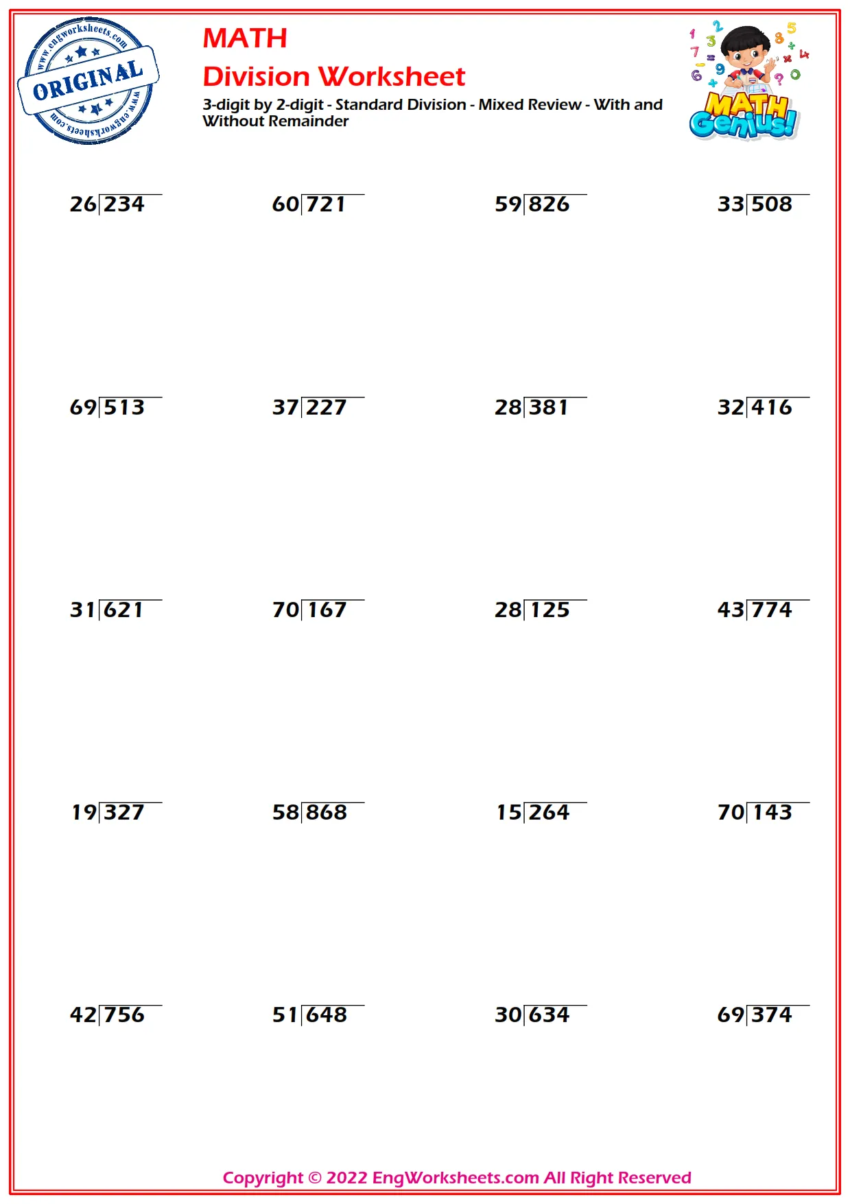 This mixed review worksheet contains 3-digit by 2-digit standard division problems with and without remainders. Test your division skills by practicing with a variety of problems.
