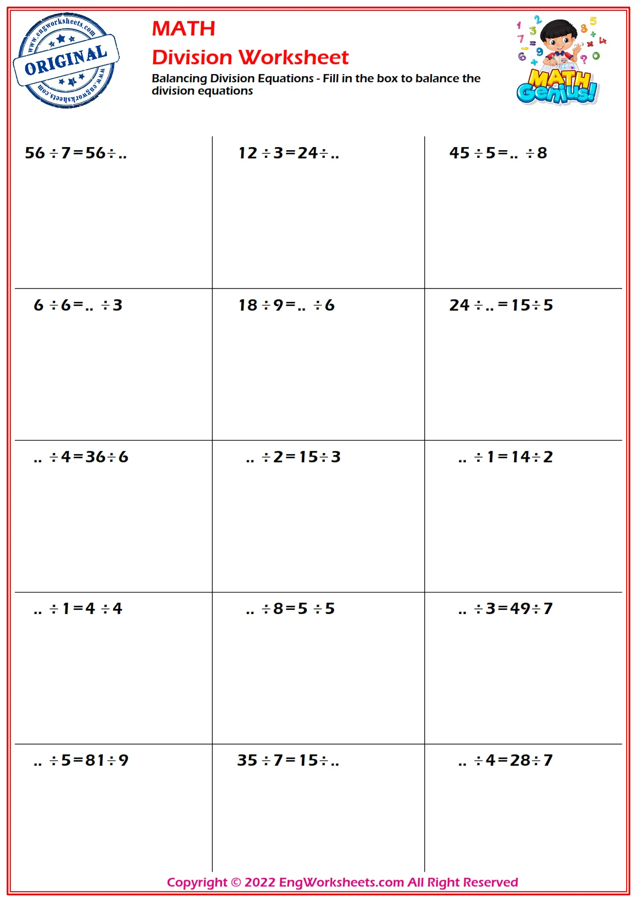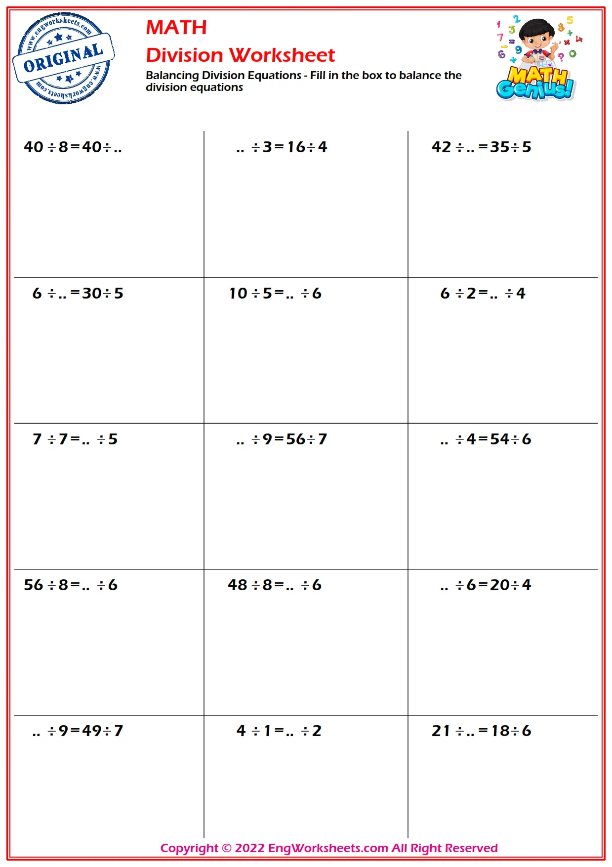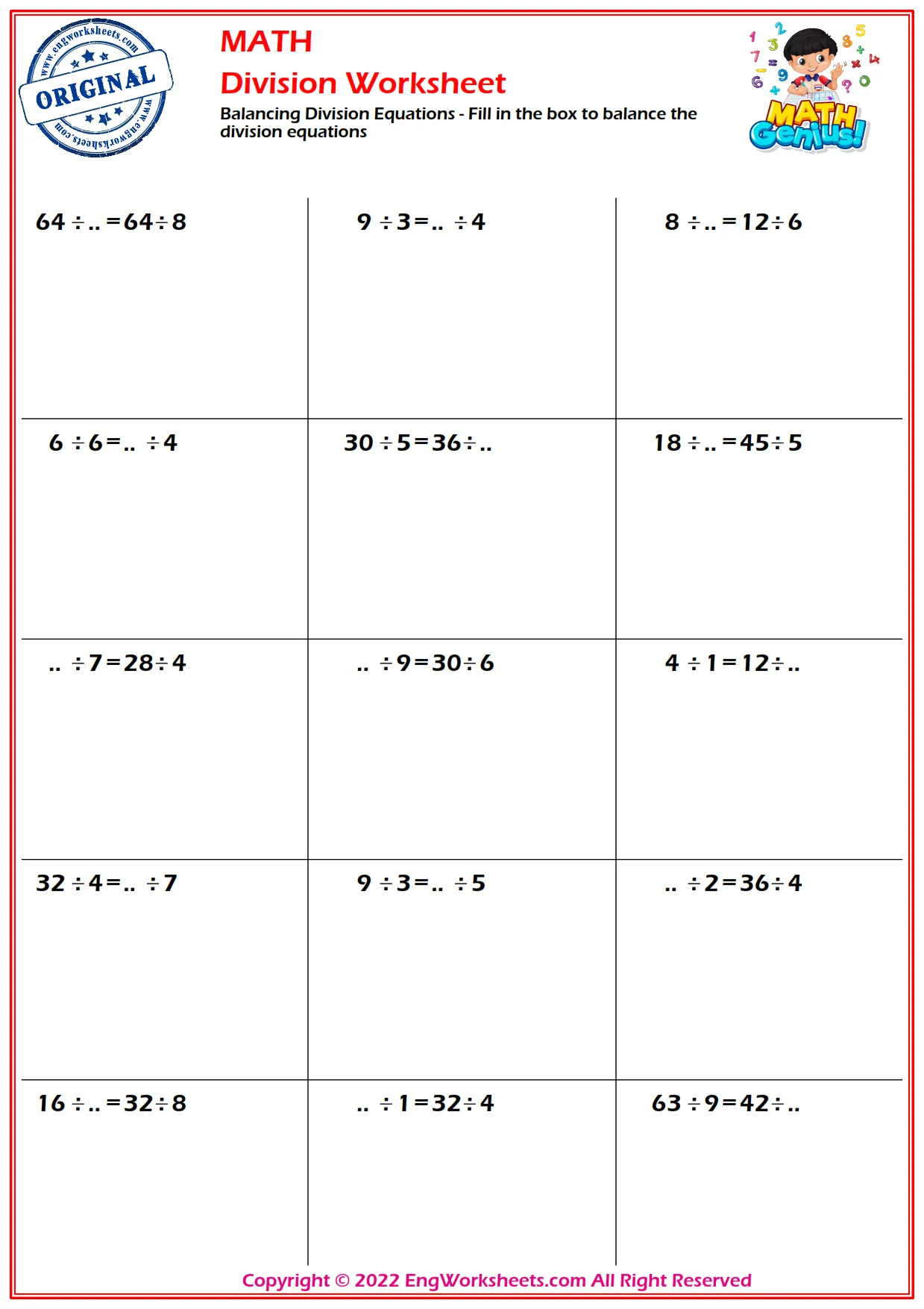 Balance Division Equations with Ease - Practice balancing division equations by filling in the missing numbers to make them equal.