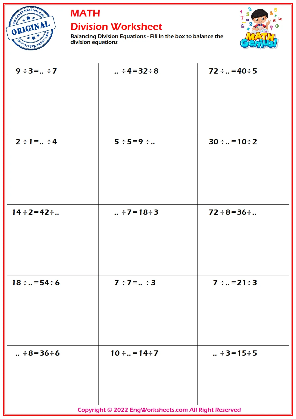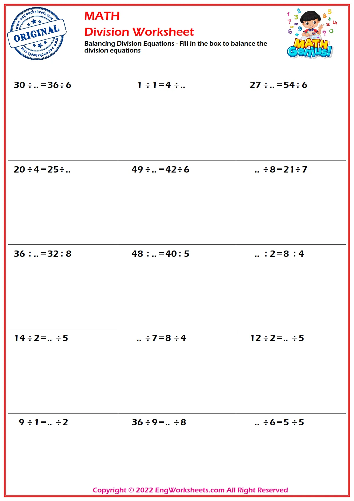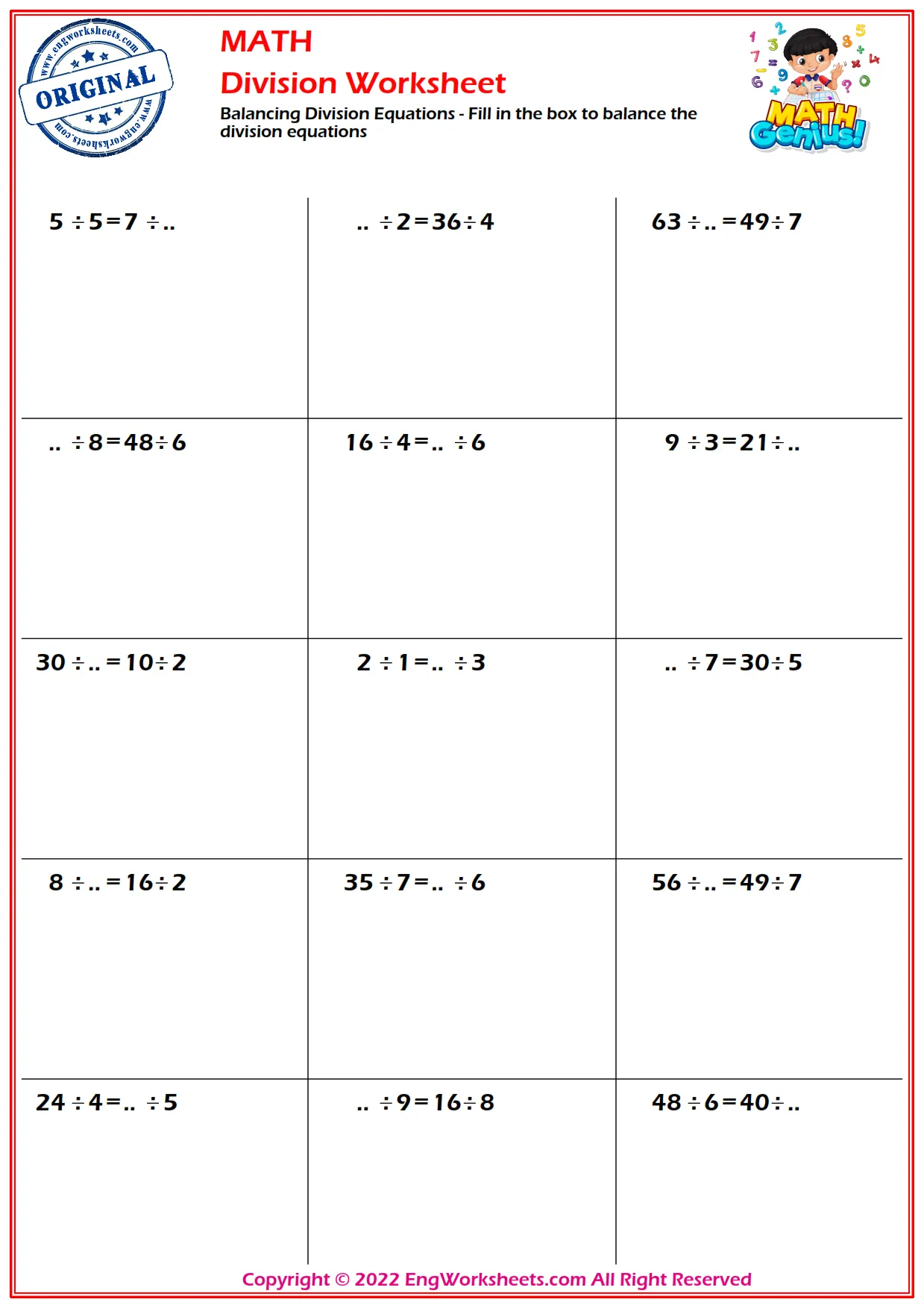 Balance Division Equations with Ease - Practice balancing division equations by filling in the missing numbers to make them equal.