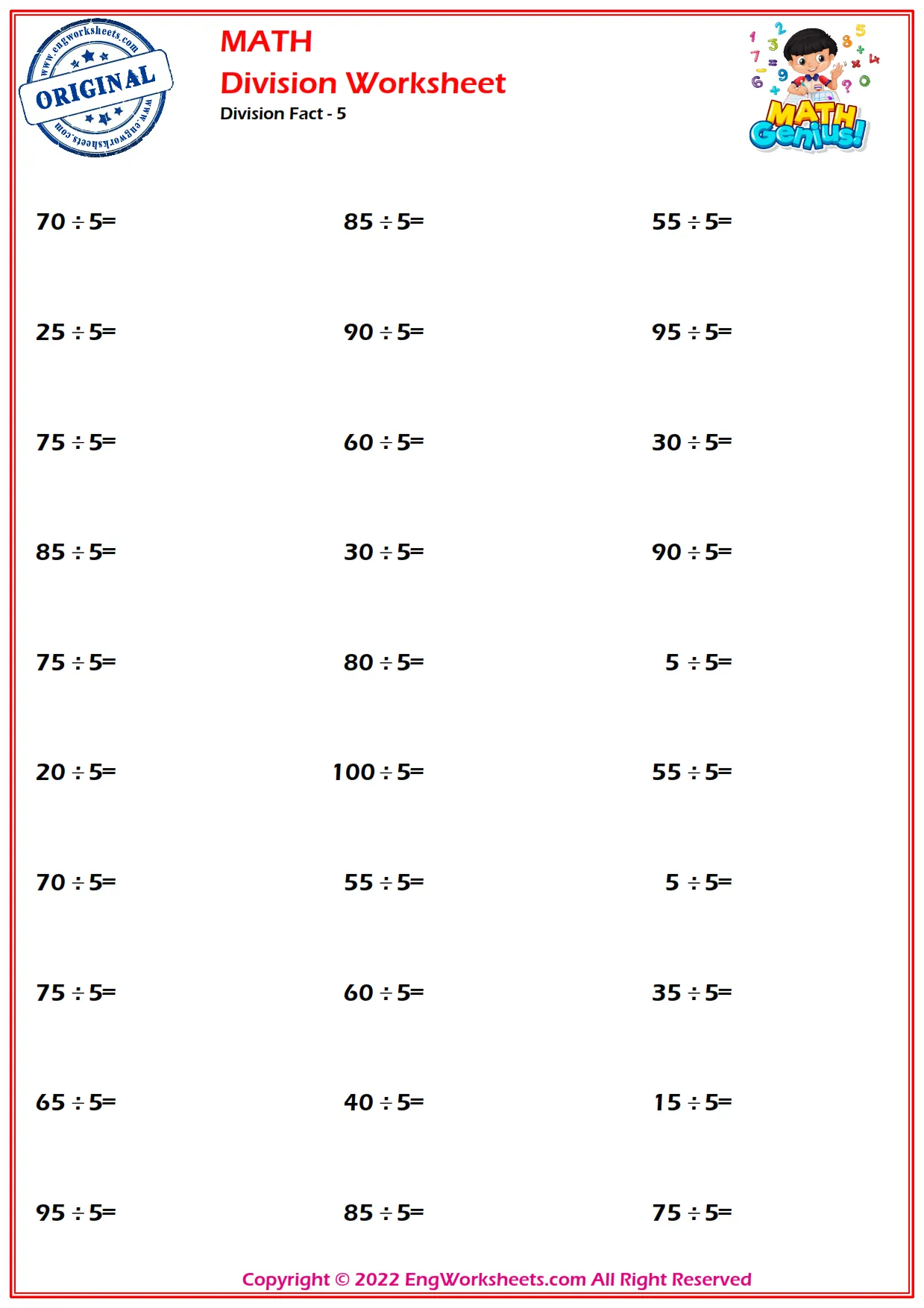 To help your kids master division, our printable worksheets include exercises that require students to repeat the 5 times division table and find the division. With these exercises, kids can quickly and easily develop their division skills.