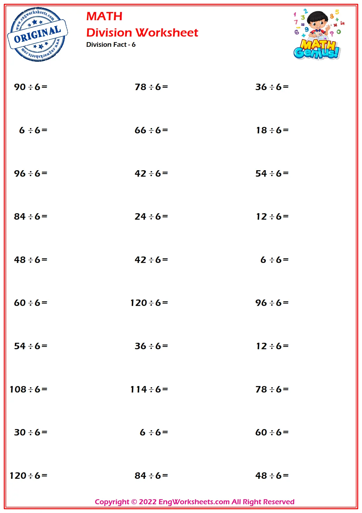 Make learning division fun with Division Fact 6 worksheets that allow children to practice their math skills while having fun.