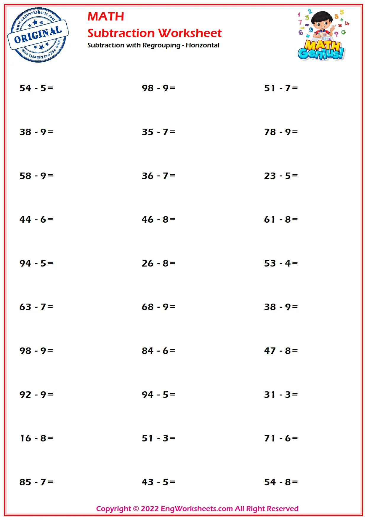 Learn how to subtract with regrouping using horizontal subtraction worksheets. These printable worksheets are perfect for students who are ready to advance their subtraction skills.