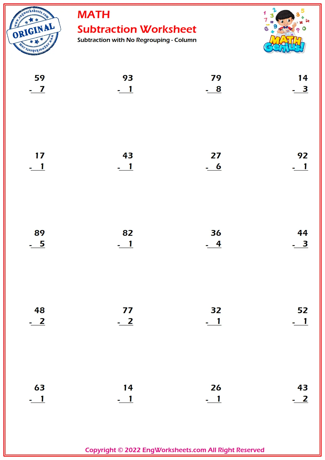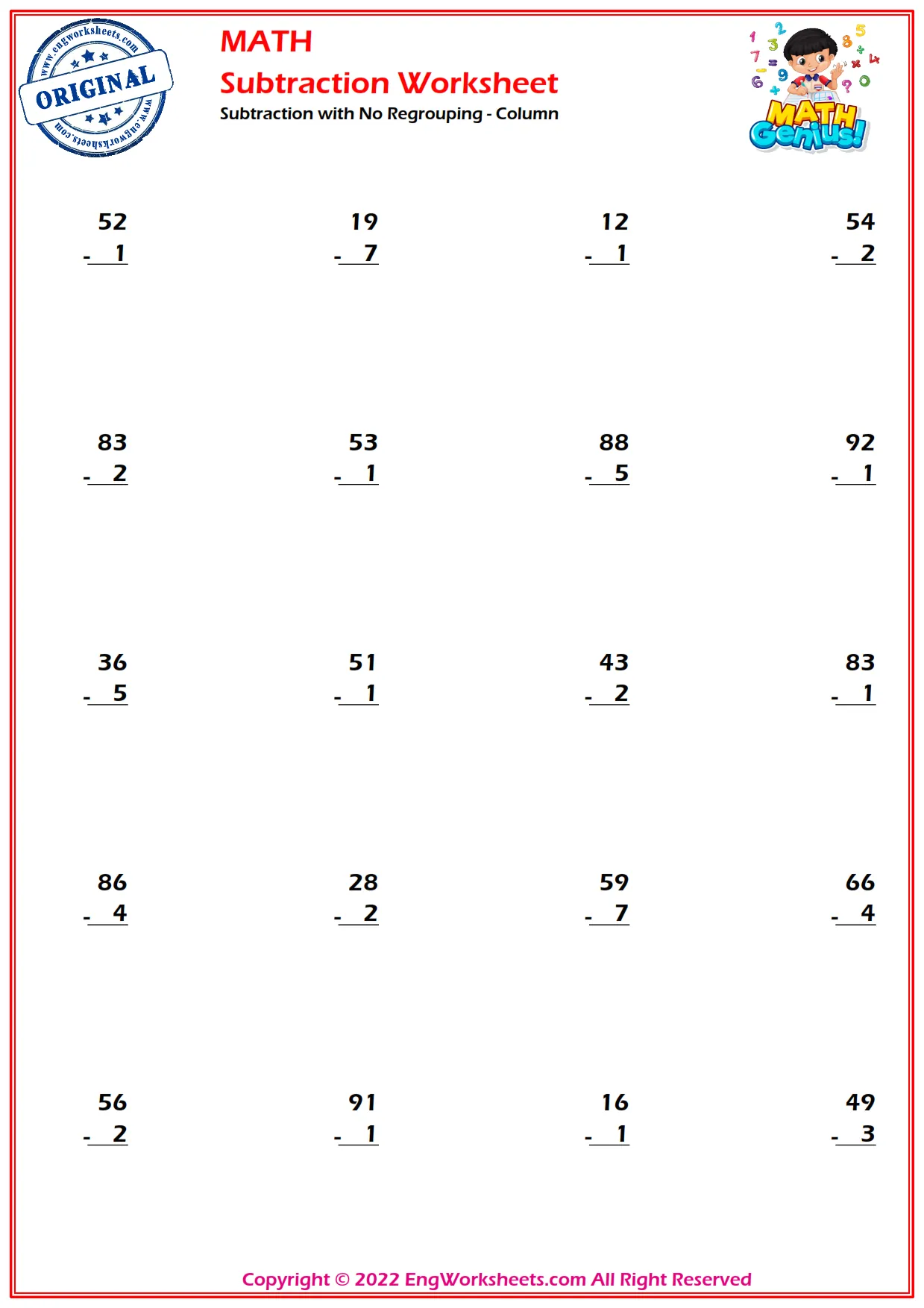 Subtraction with No Regrouping - Horizontal