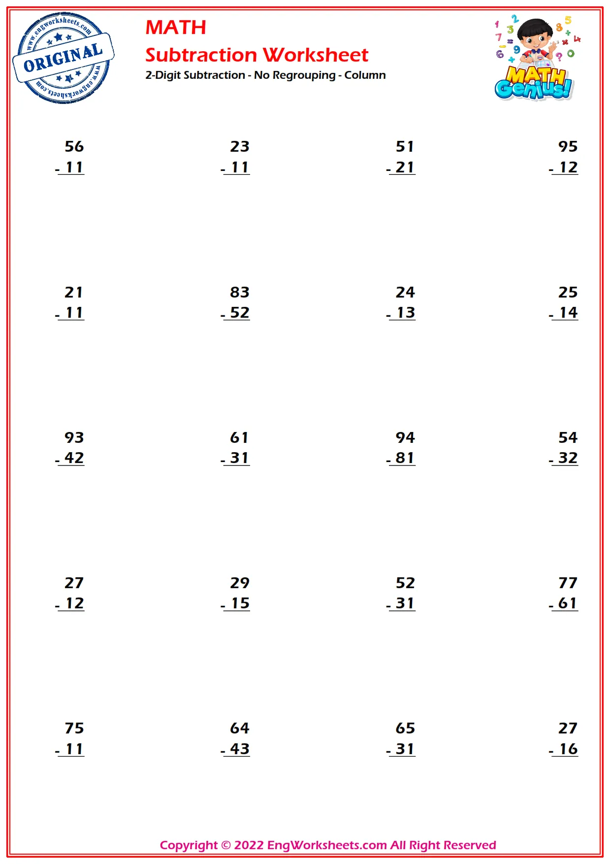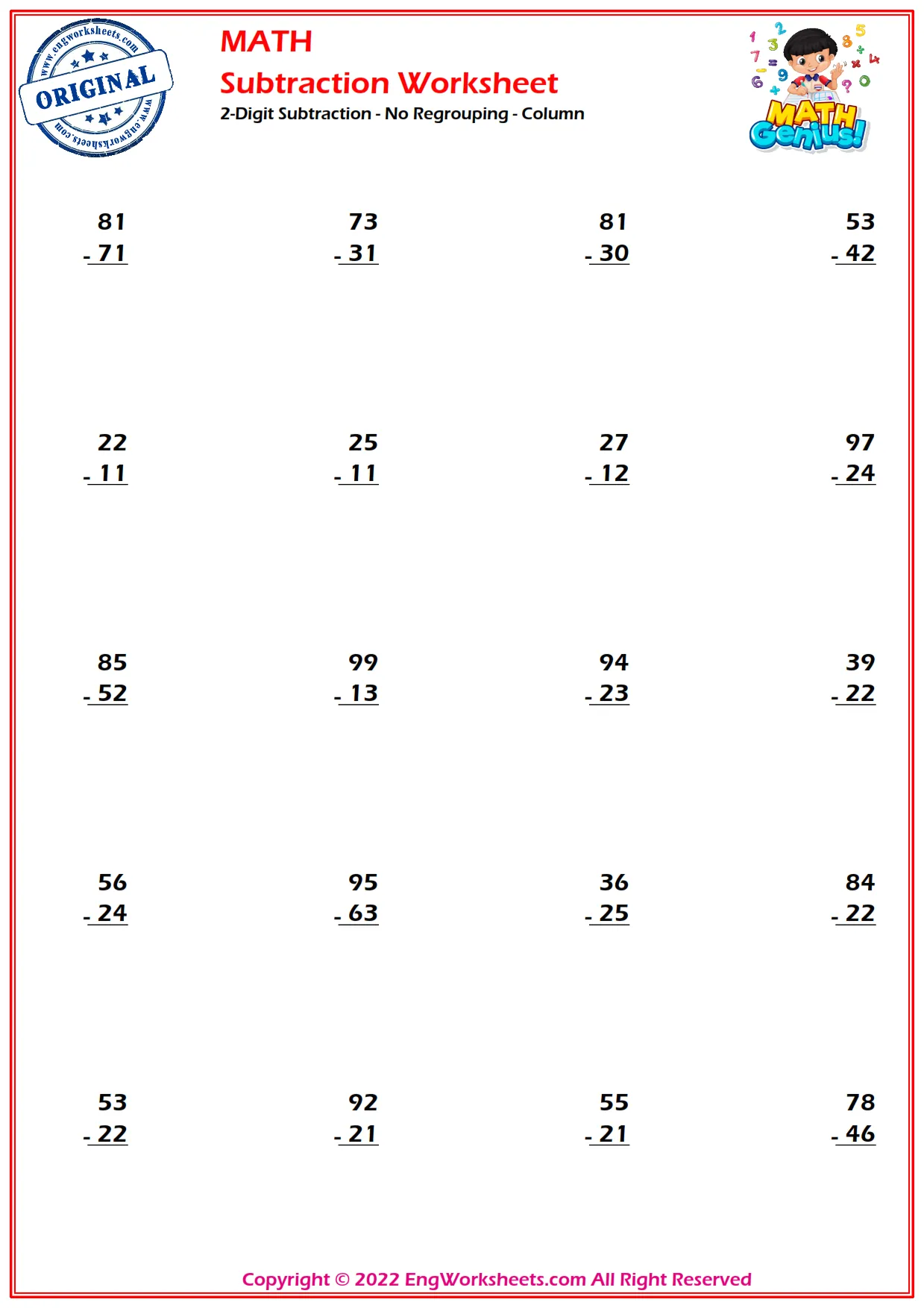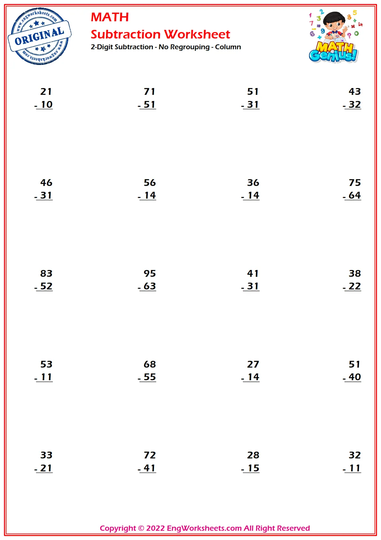 Practice 2-digit subtraction without regrouping using column subtraction worksheets. These worksheets are great for students who are just starting to learn subtraction.