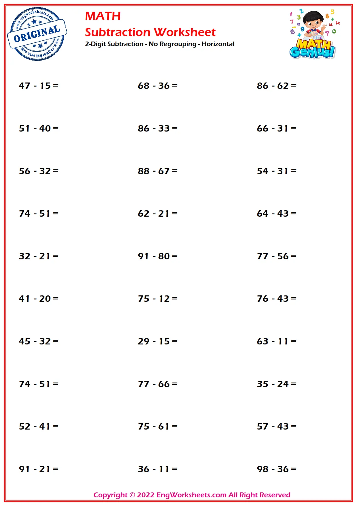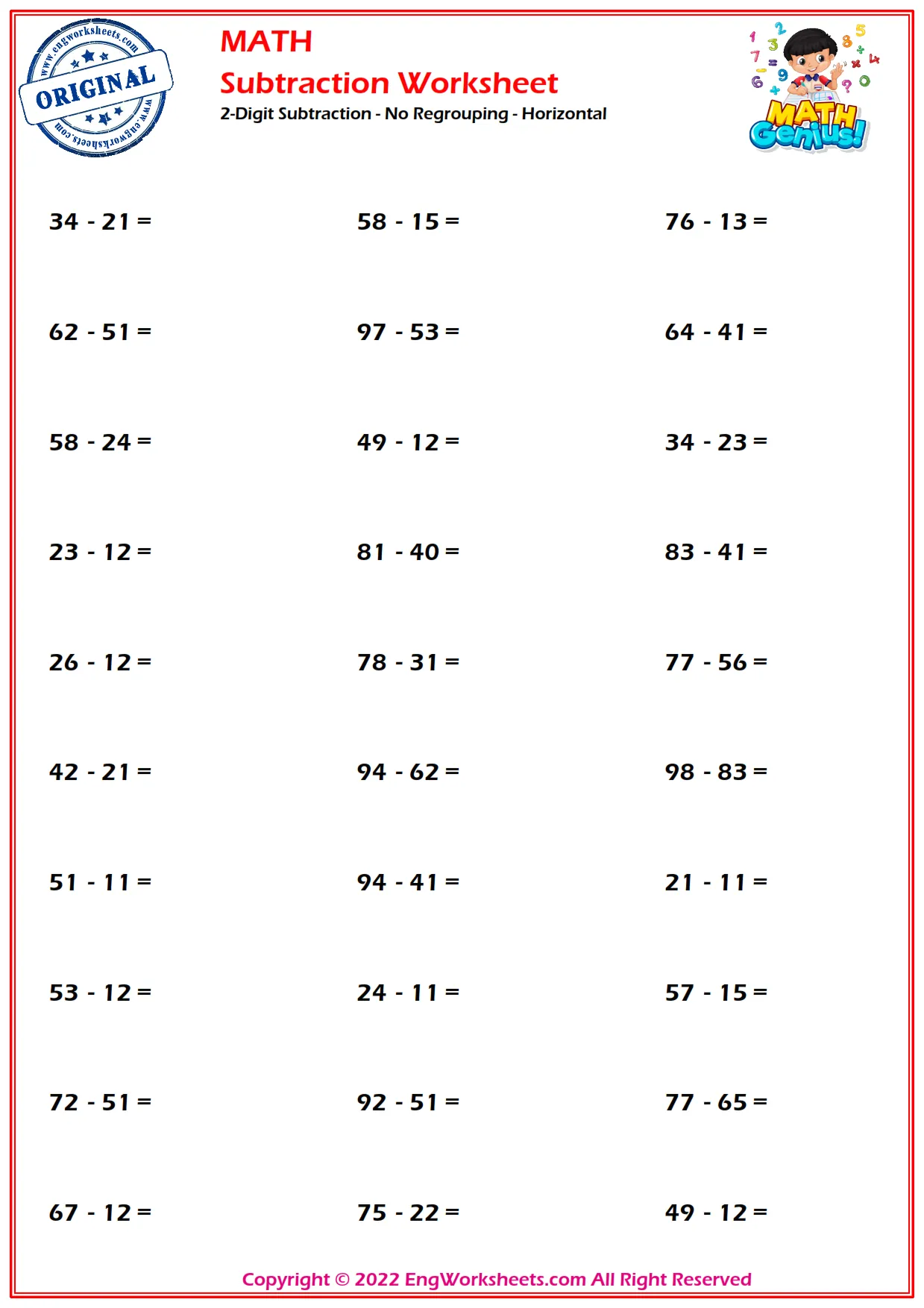 Our double-digit subtraction worksheets without regrouping/borrowing are perfect for beginners. Students can practice finding the difference between sets of 2-digit numbers with ease. Download and print these free PDFs today to give your students the practice they need to succeed in subtraction.