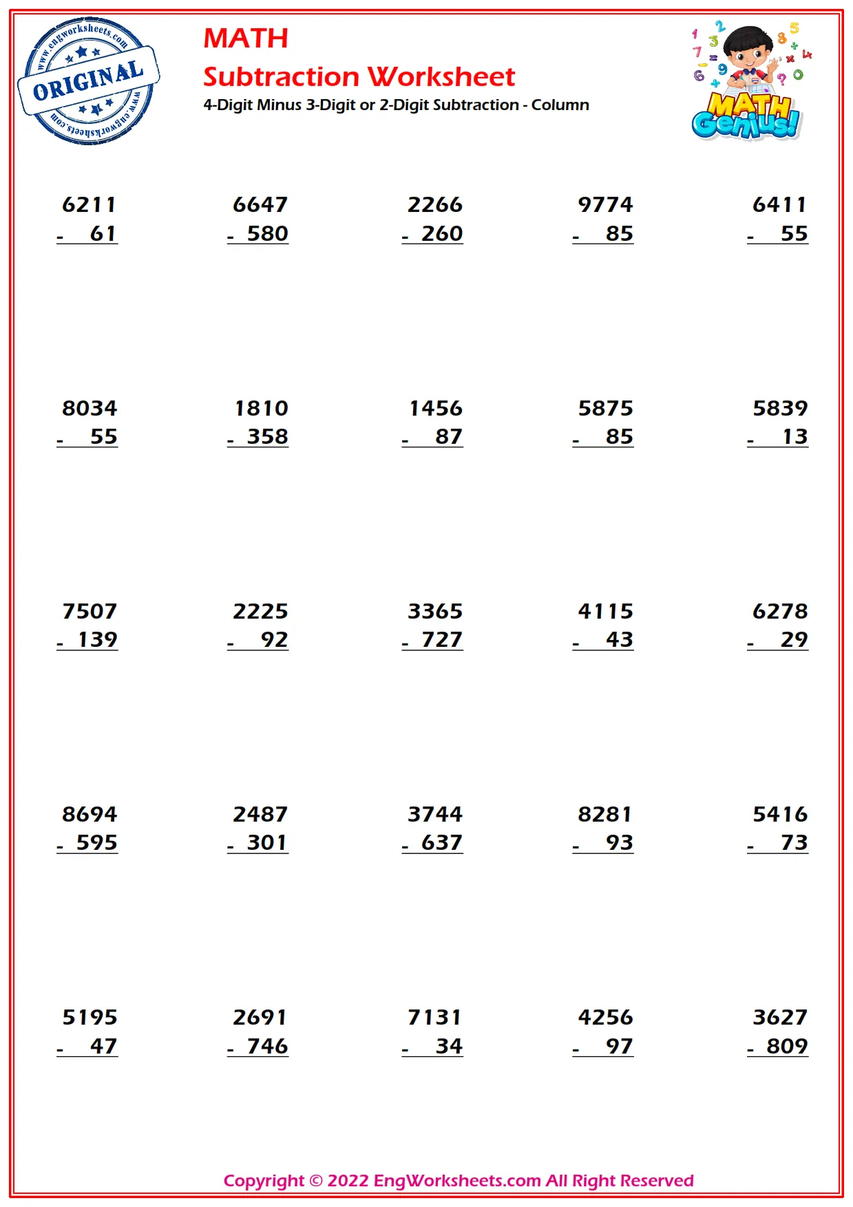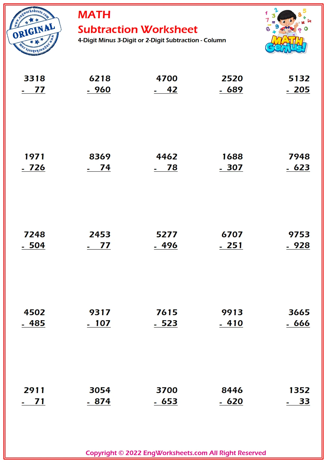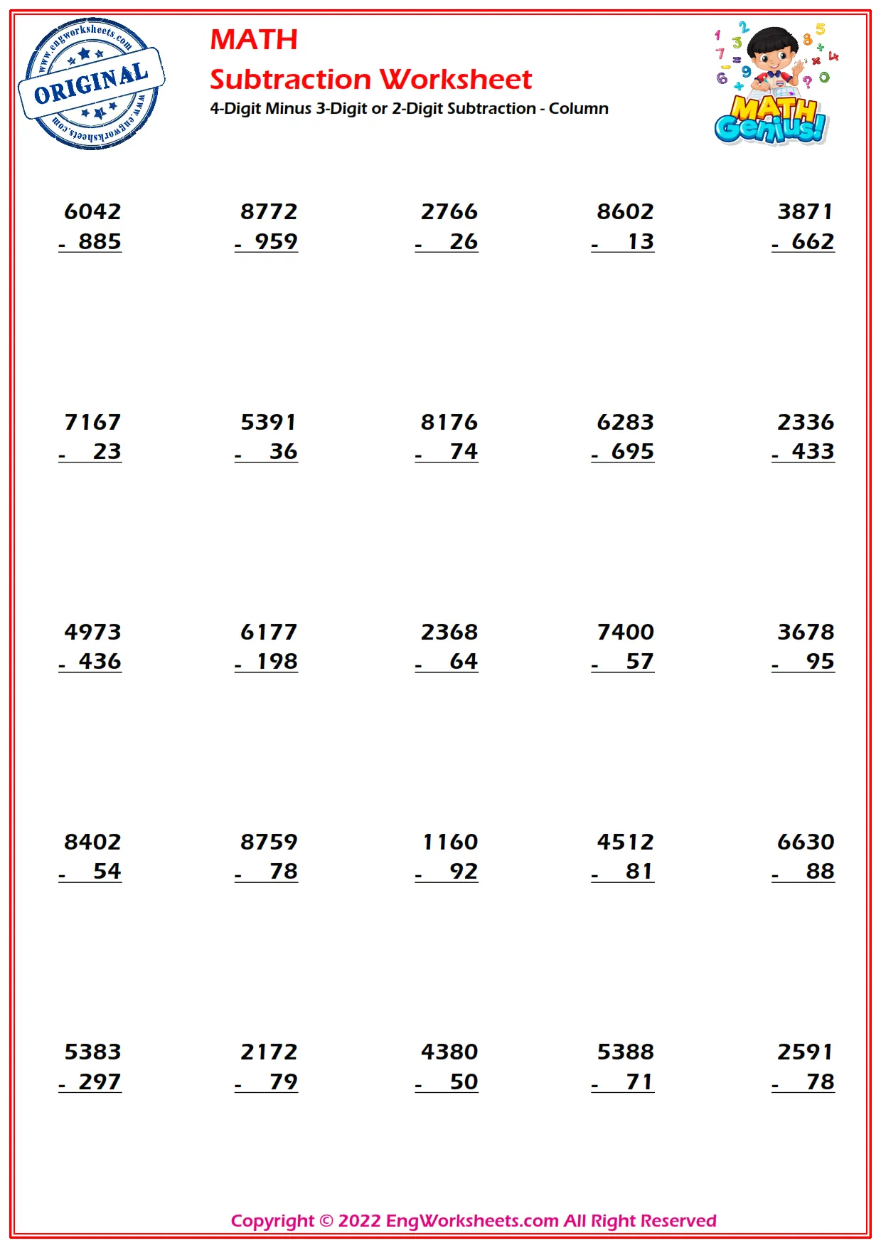 Practice your subtraction skills with our column subtraction worksheet that includes 4-digit minus 3-digit or 2-digit subtraction problems.
