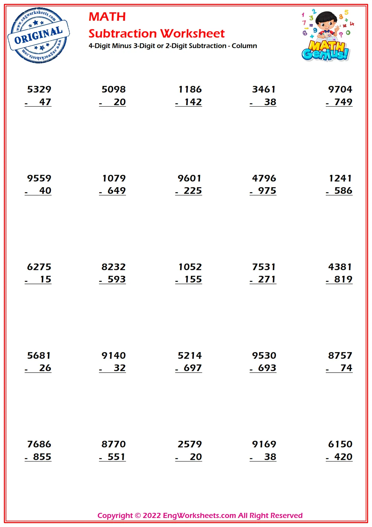 Enhance your subtraction skills with ease by subtracting a 3-digit or 2-digit number from a 4-digit number using our aligned column-subtraction problems. Our printable worksheets offer an ideal way to stand out in your class!