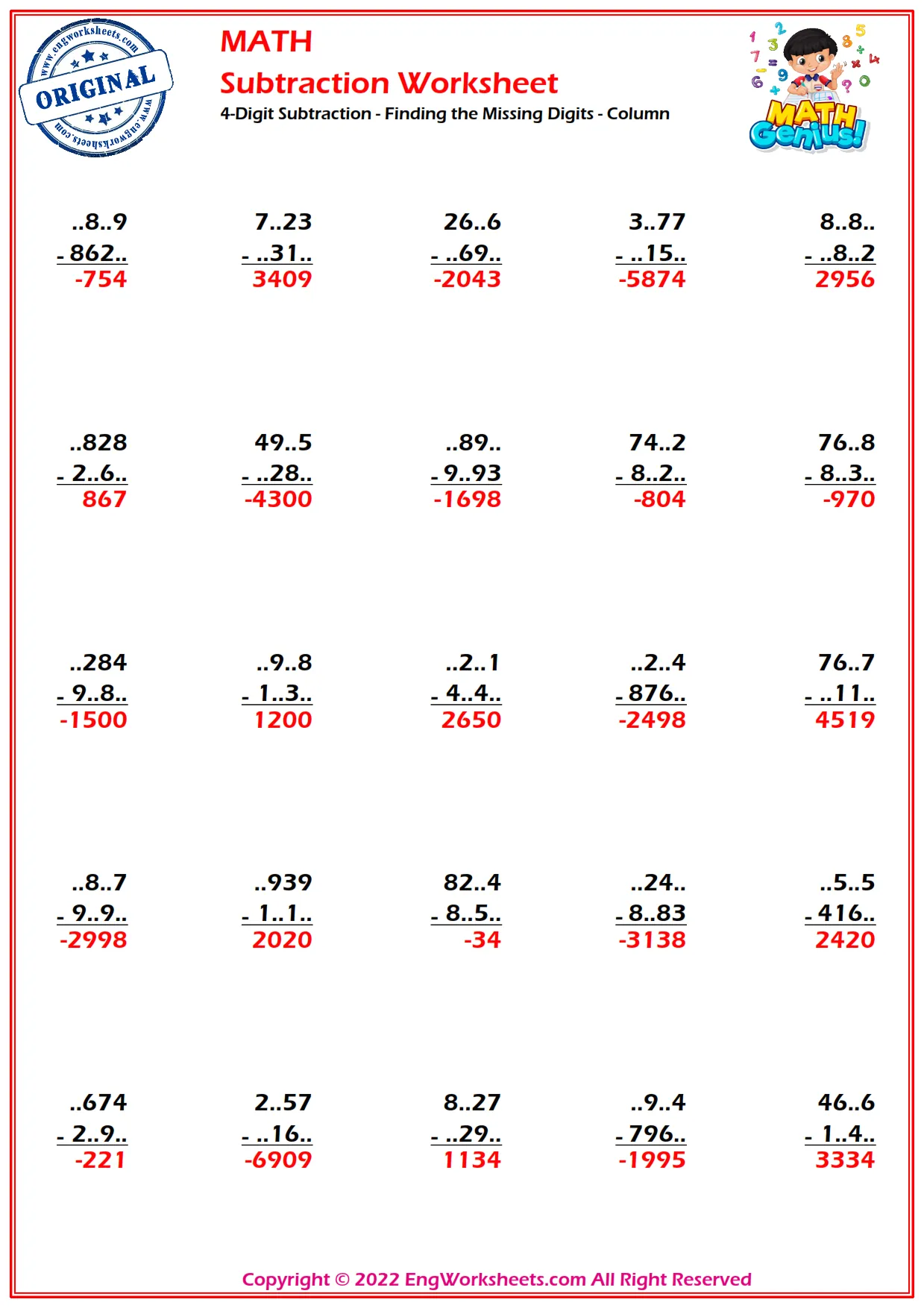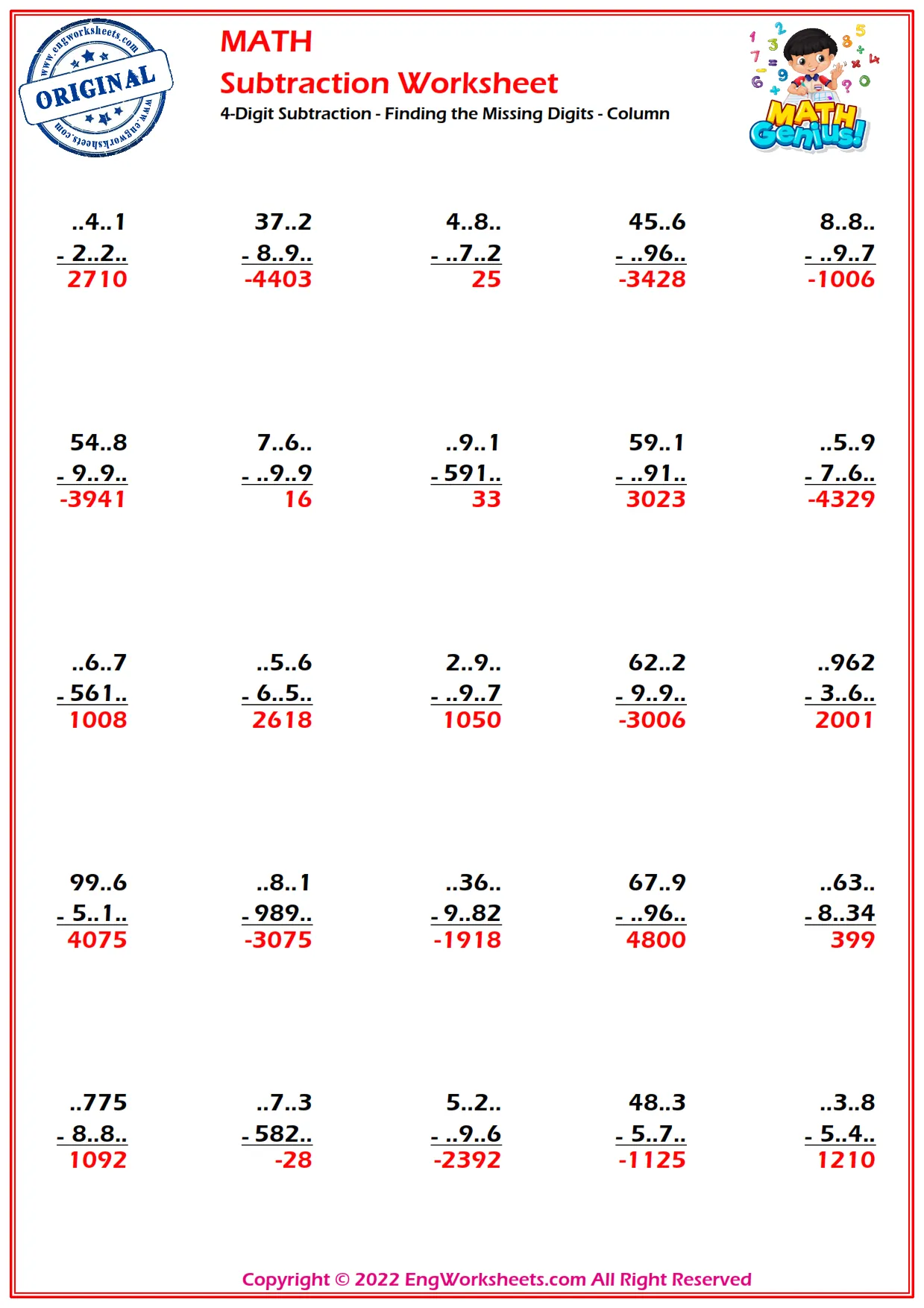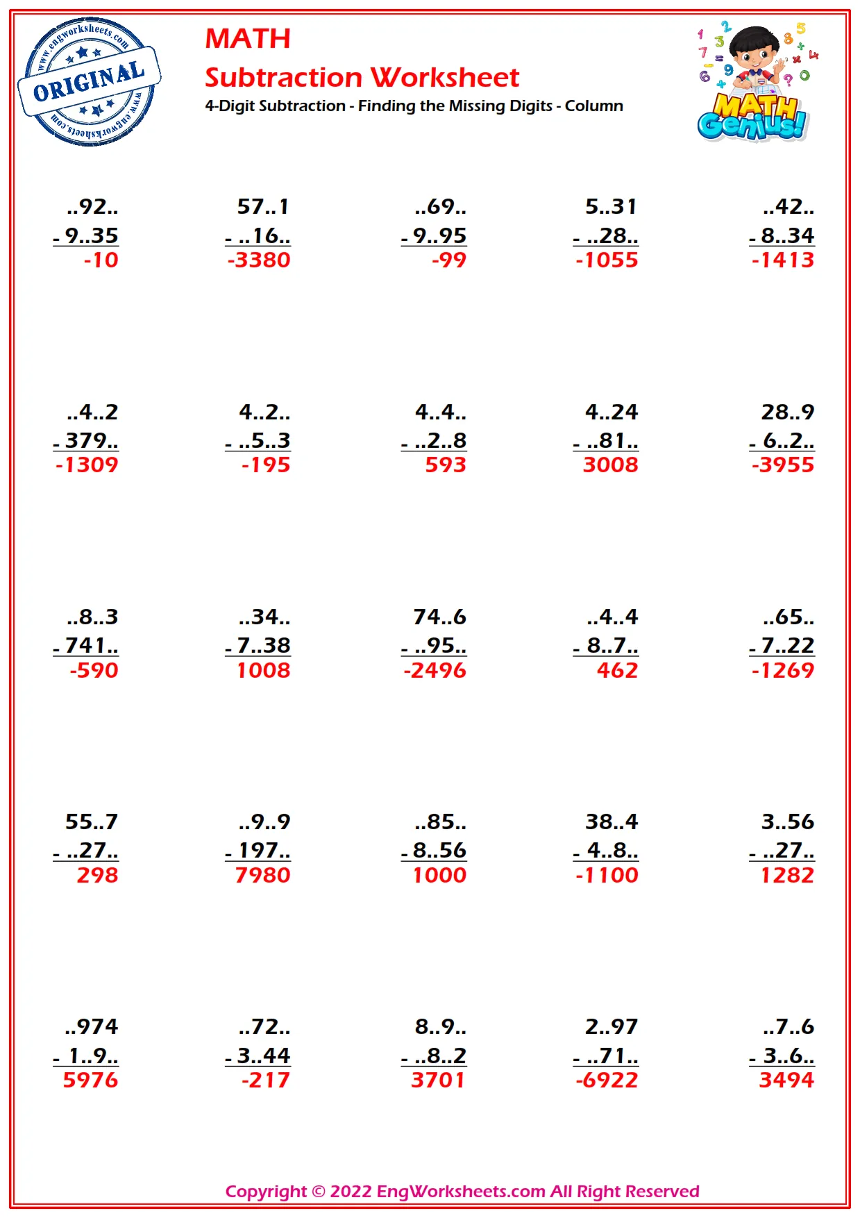 Challenge yourself with our column subtraction worksheet that features 4-digit subtraction problems with missing digits to solve.