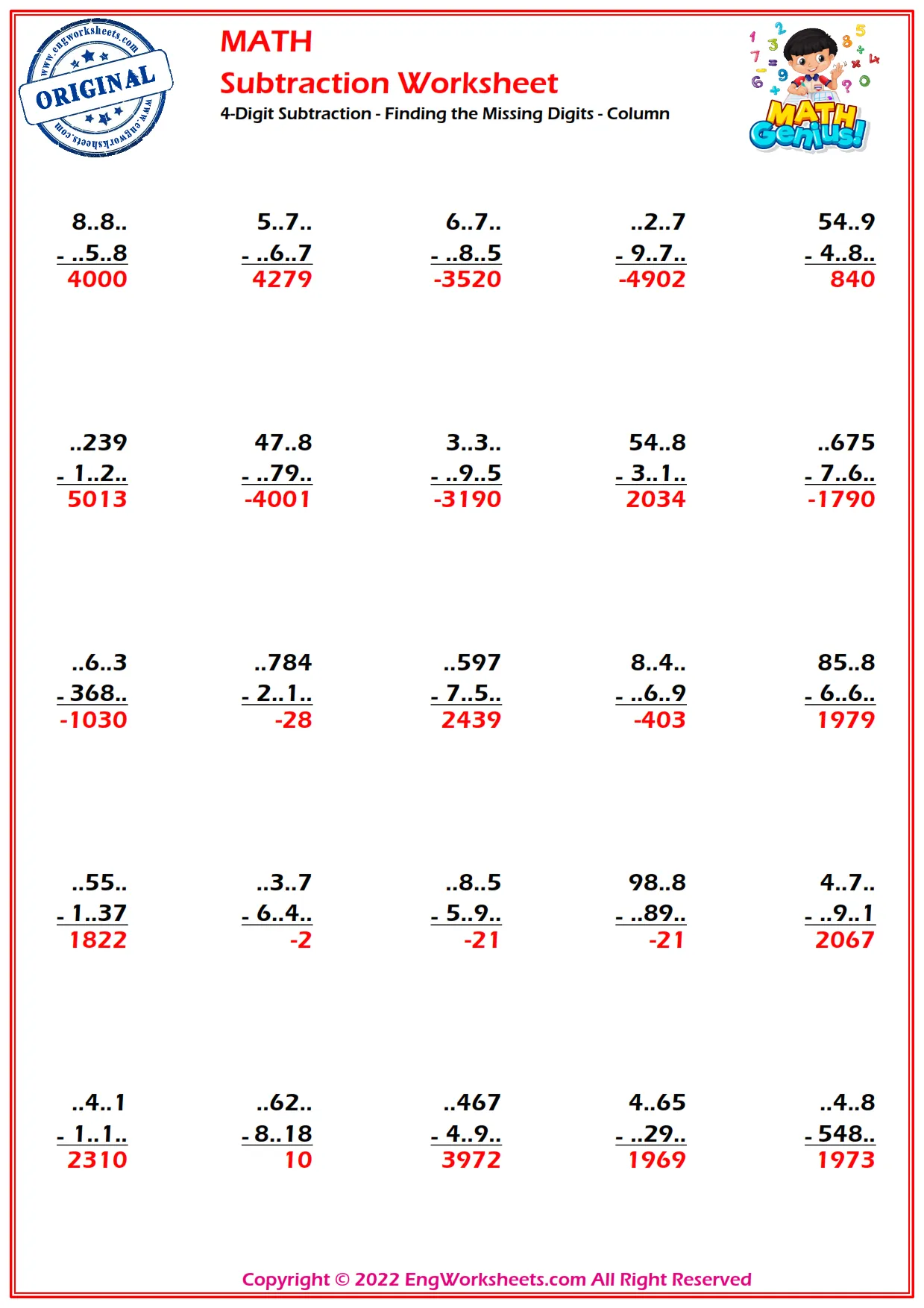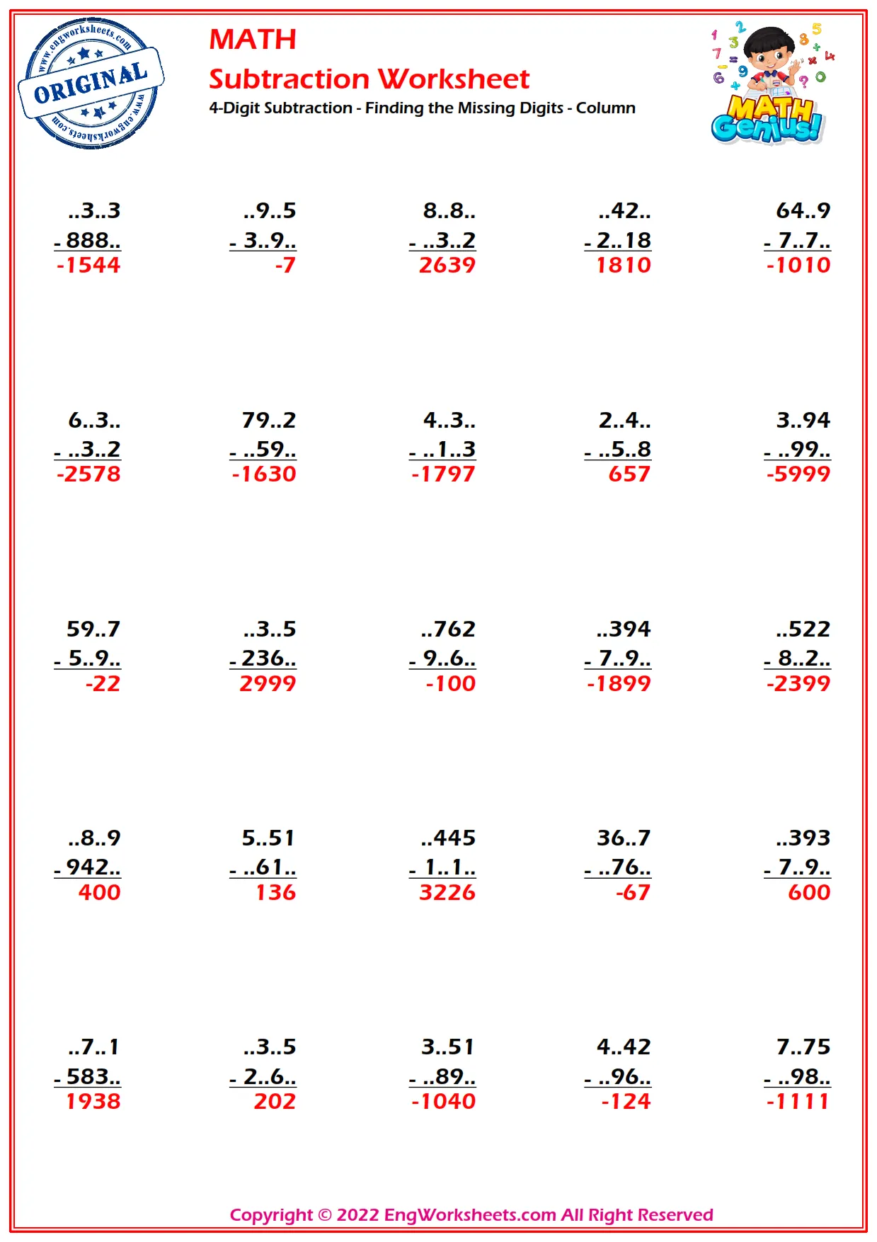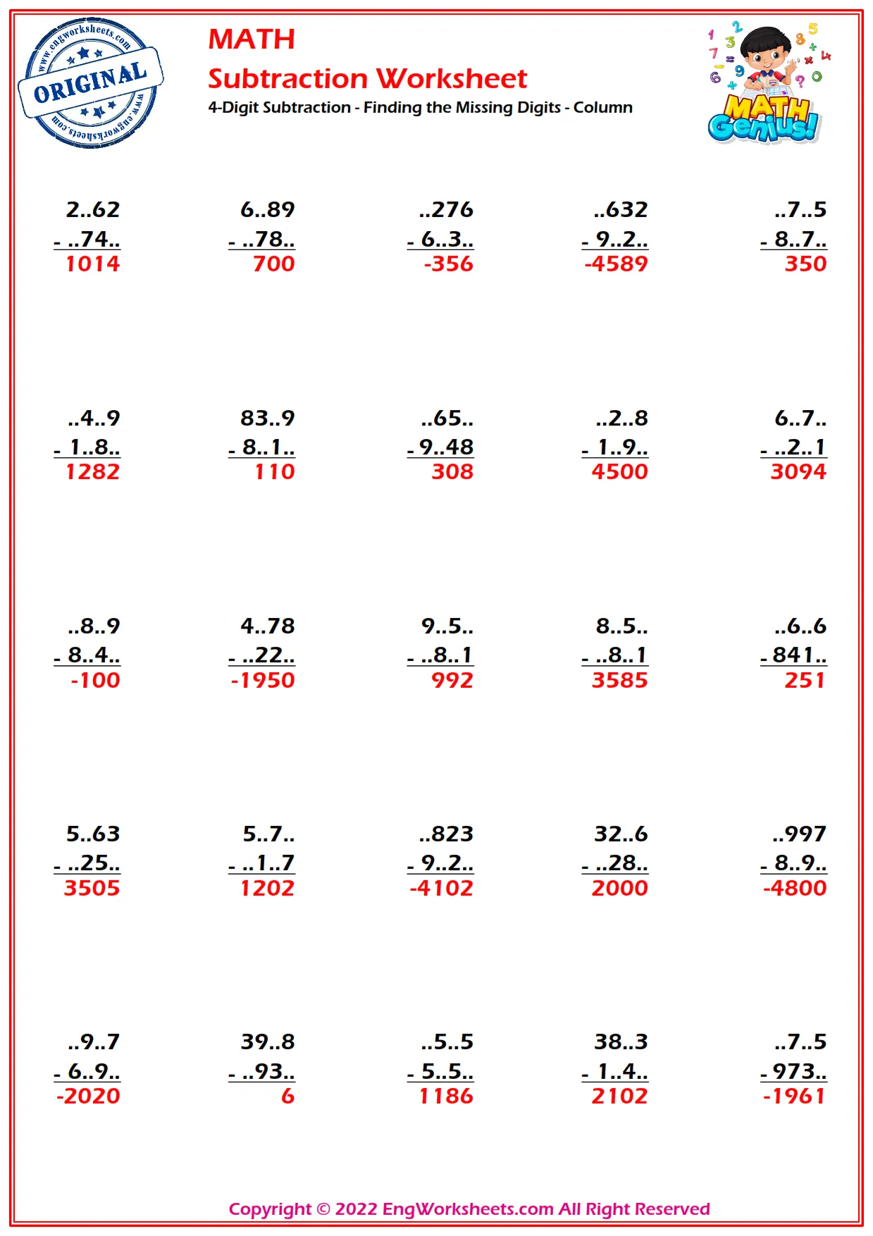 Challenge yourself with our column subtraction worksheet that features 4-digit subtraction problems with missing digits to solve.