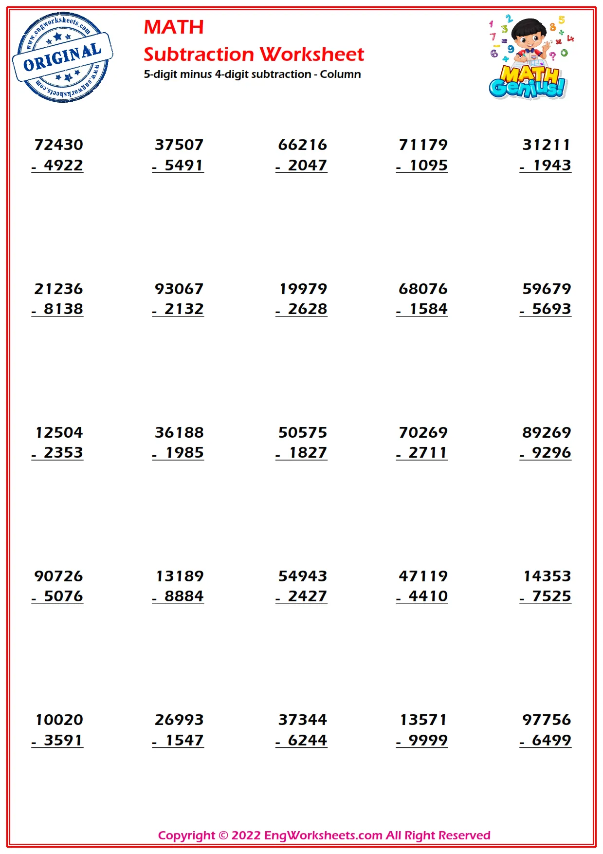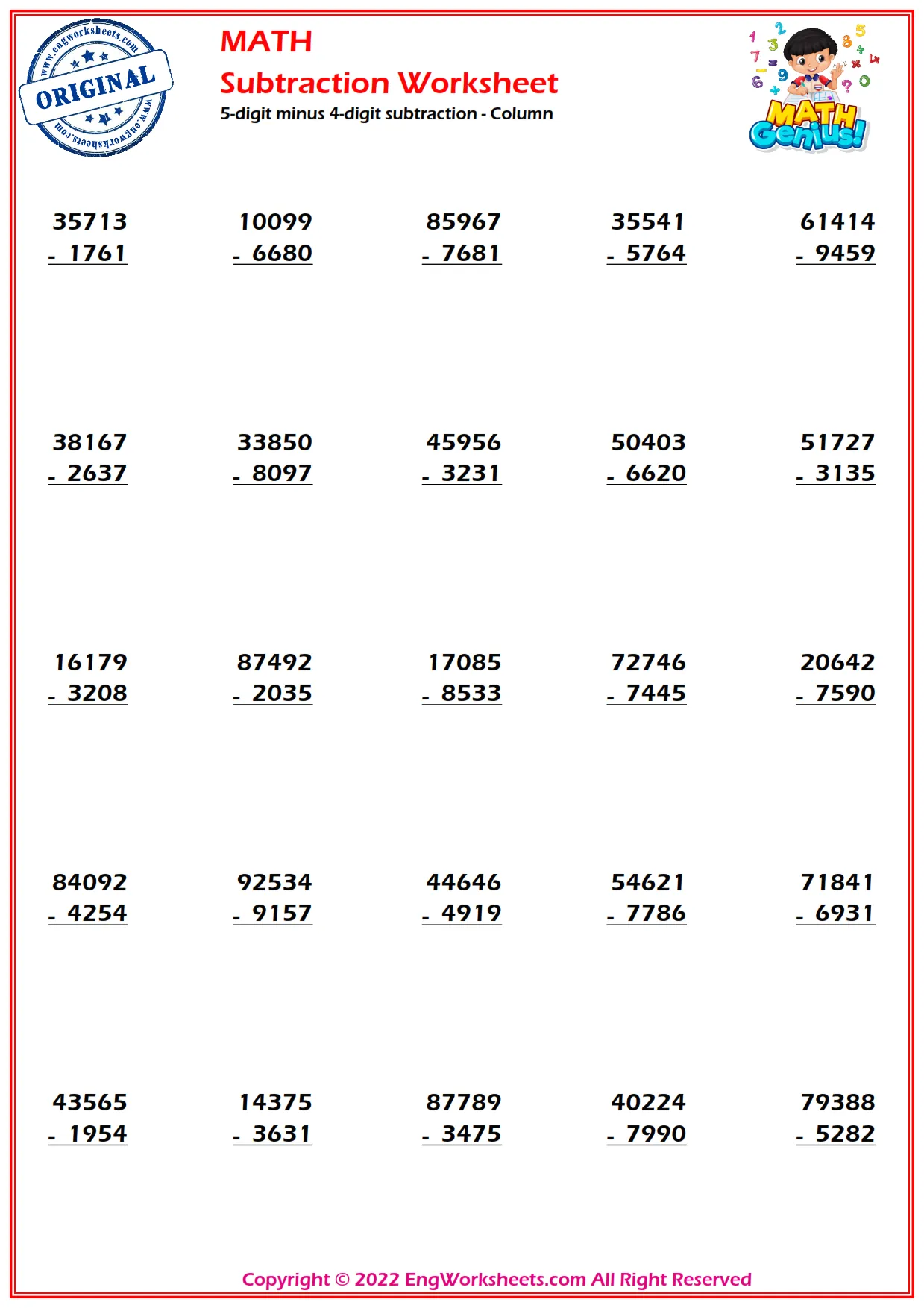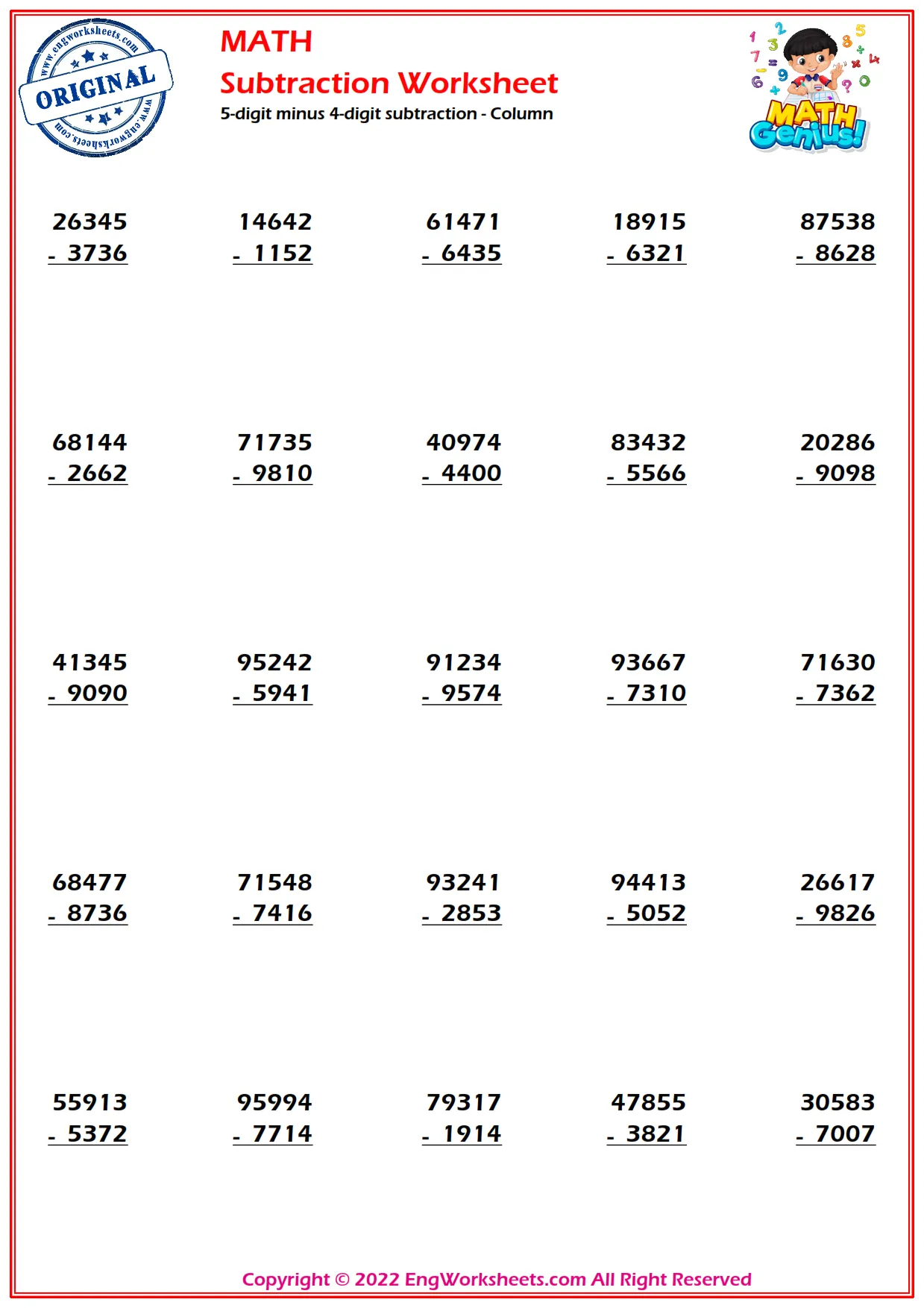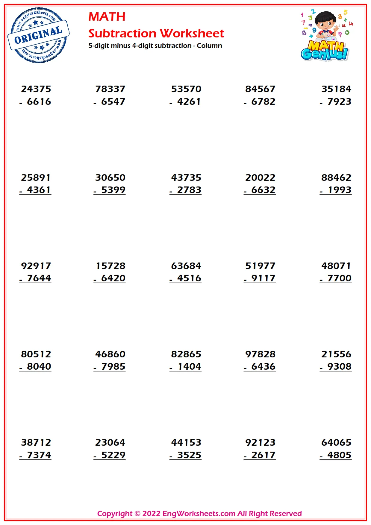 Hone your subtraction skills with our column subtraction worksheet that includes 5-digit minus 4-digit subtraction problems to solve.