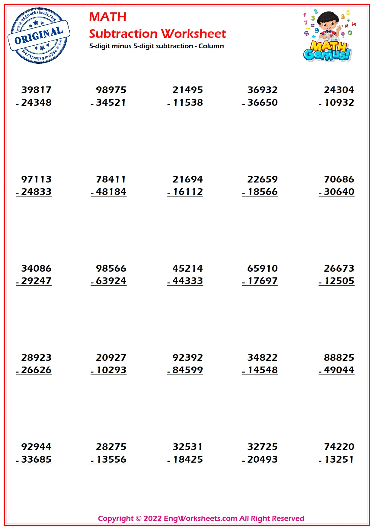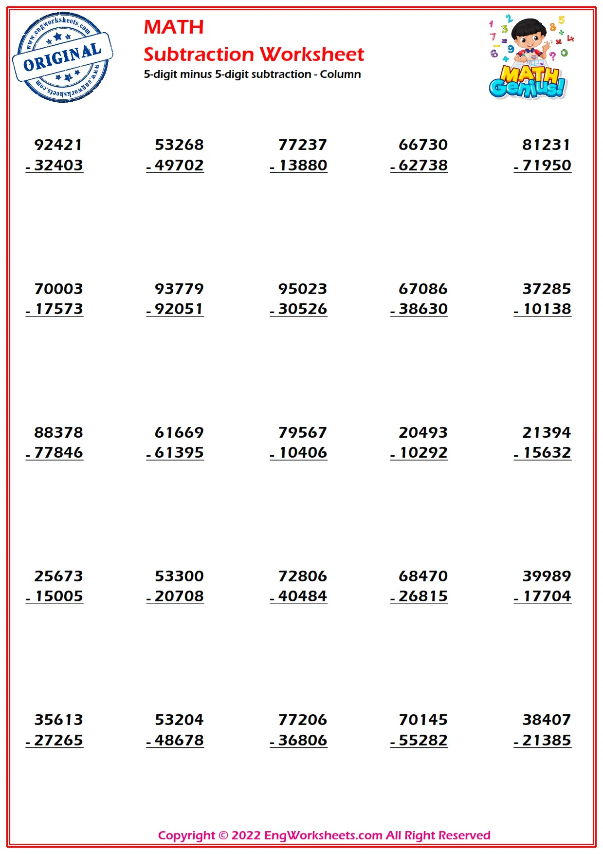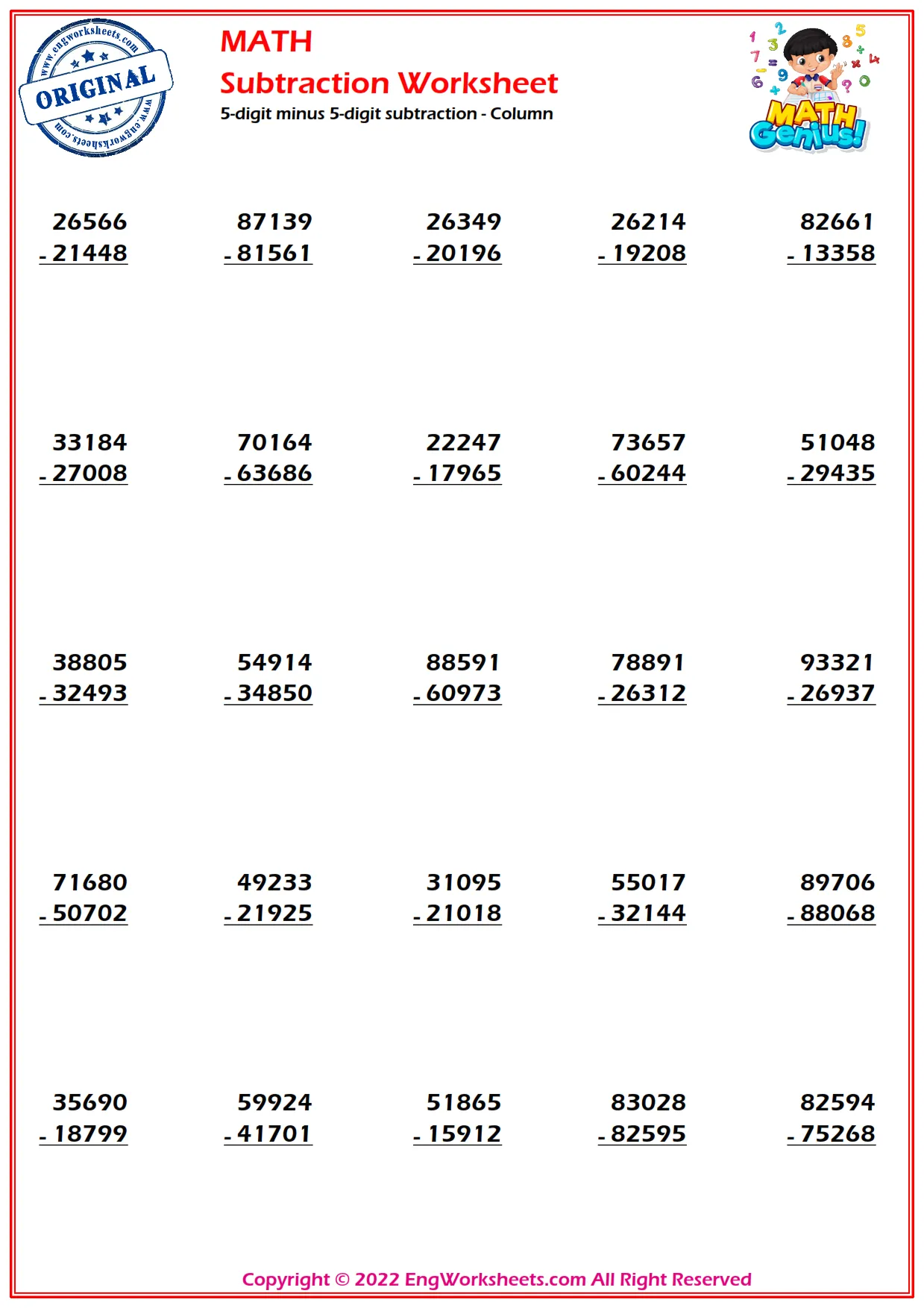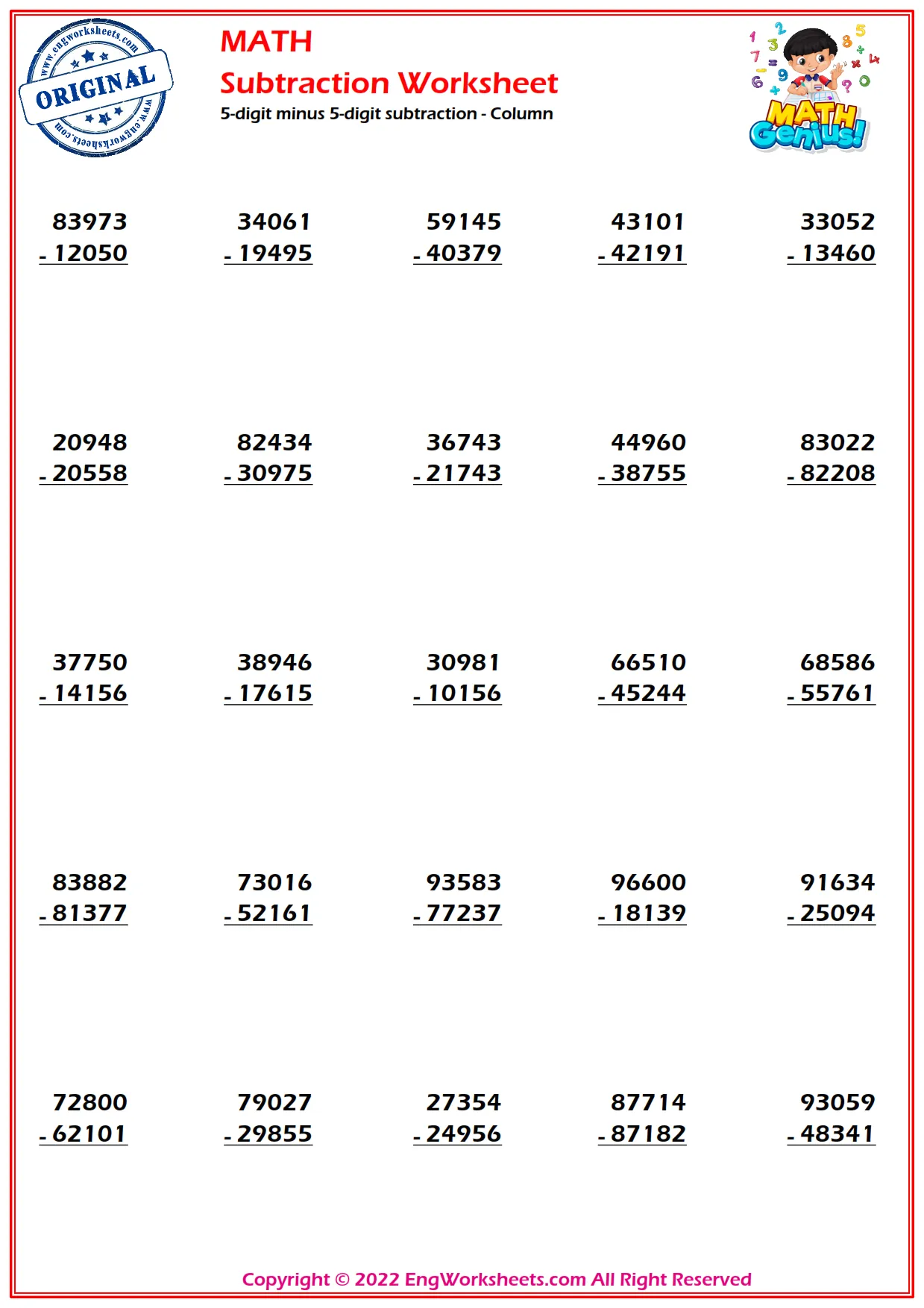 Take your subtraction skills to the next level with our column subtraction worksheet that provides 5-digit minus 5-digit subtraction problems to solve using column method.