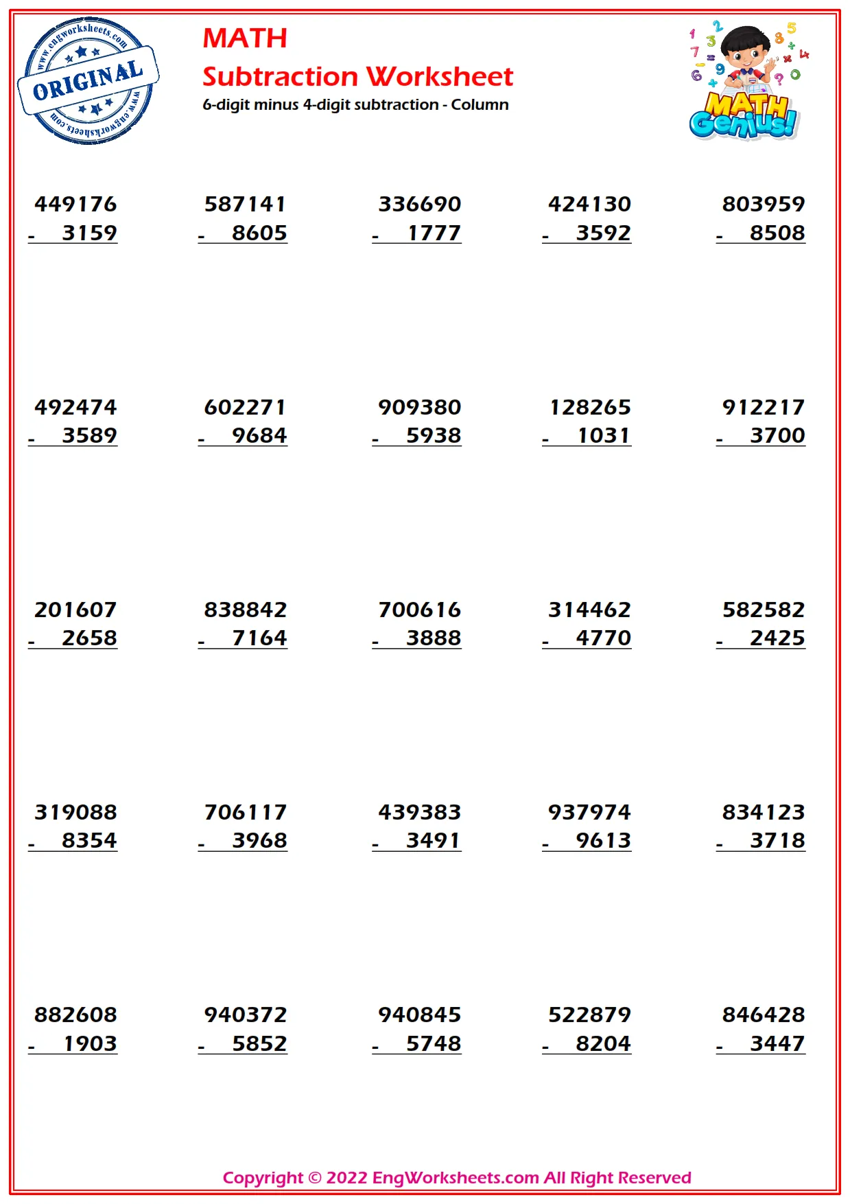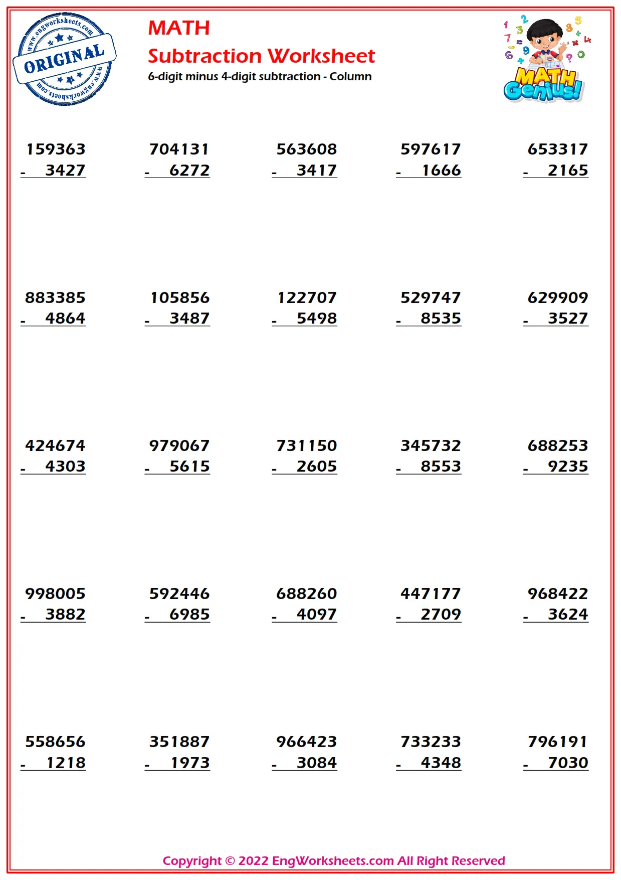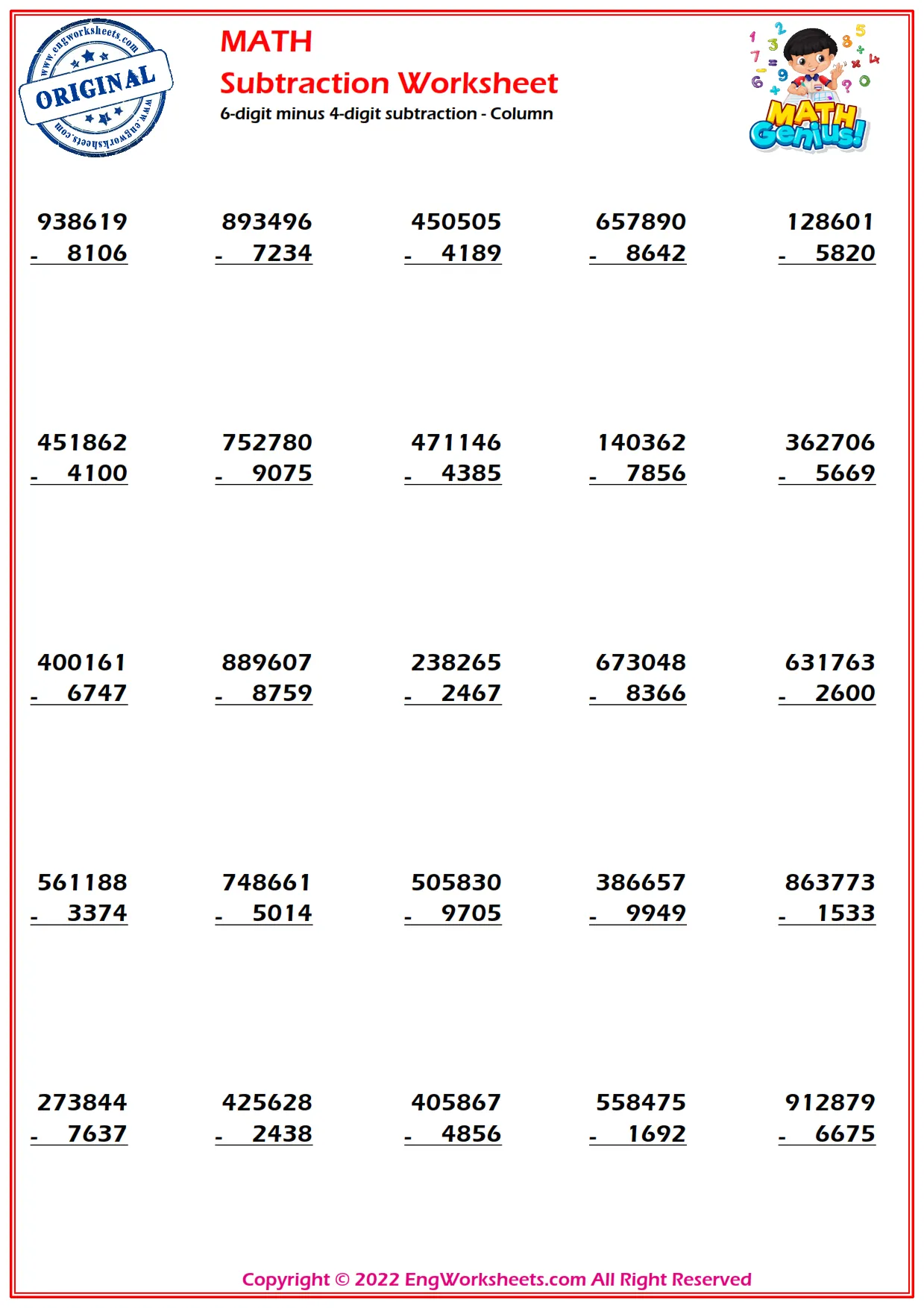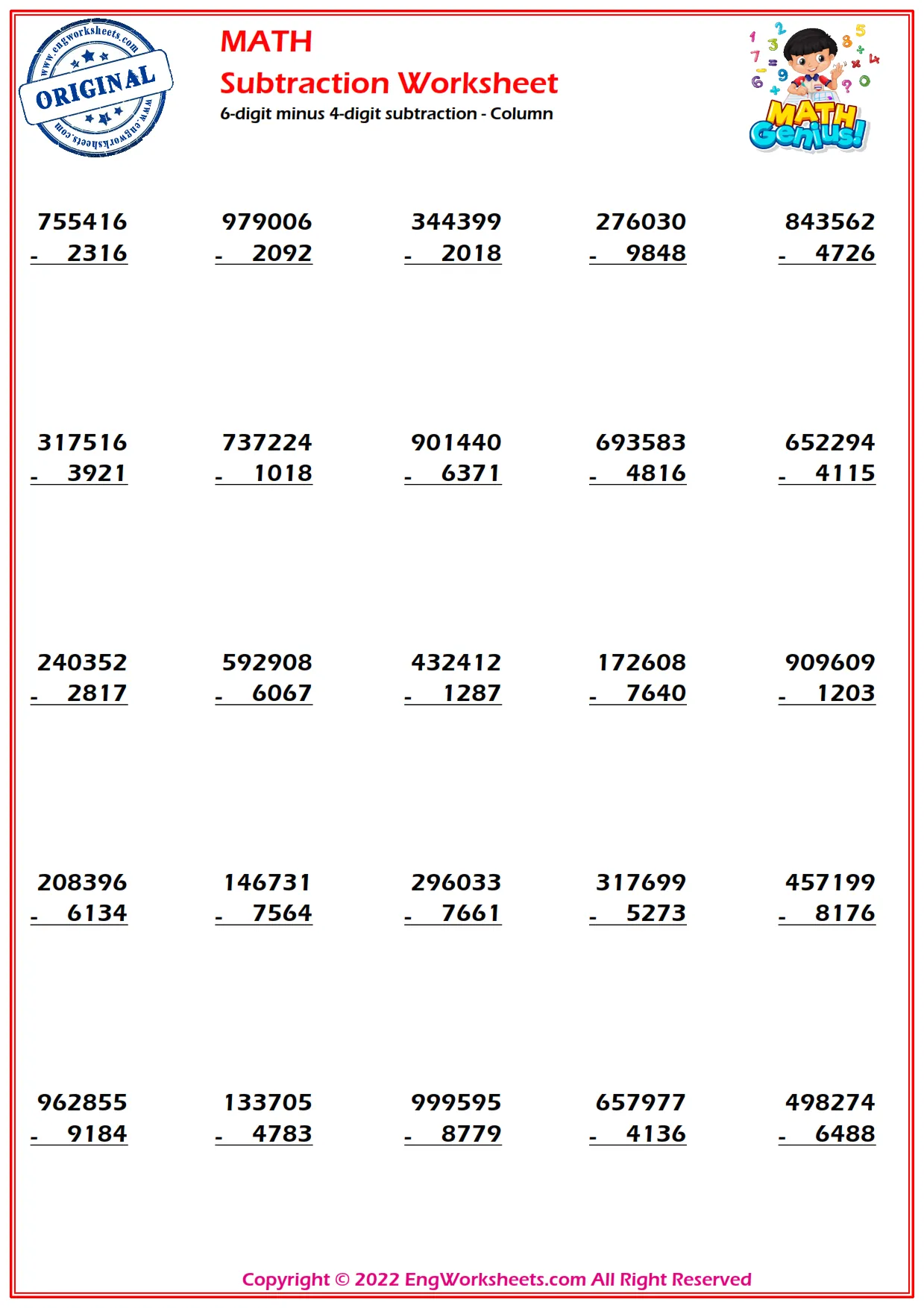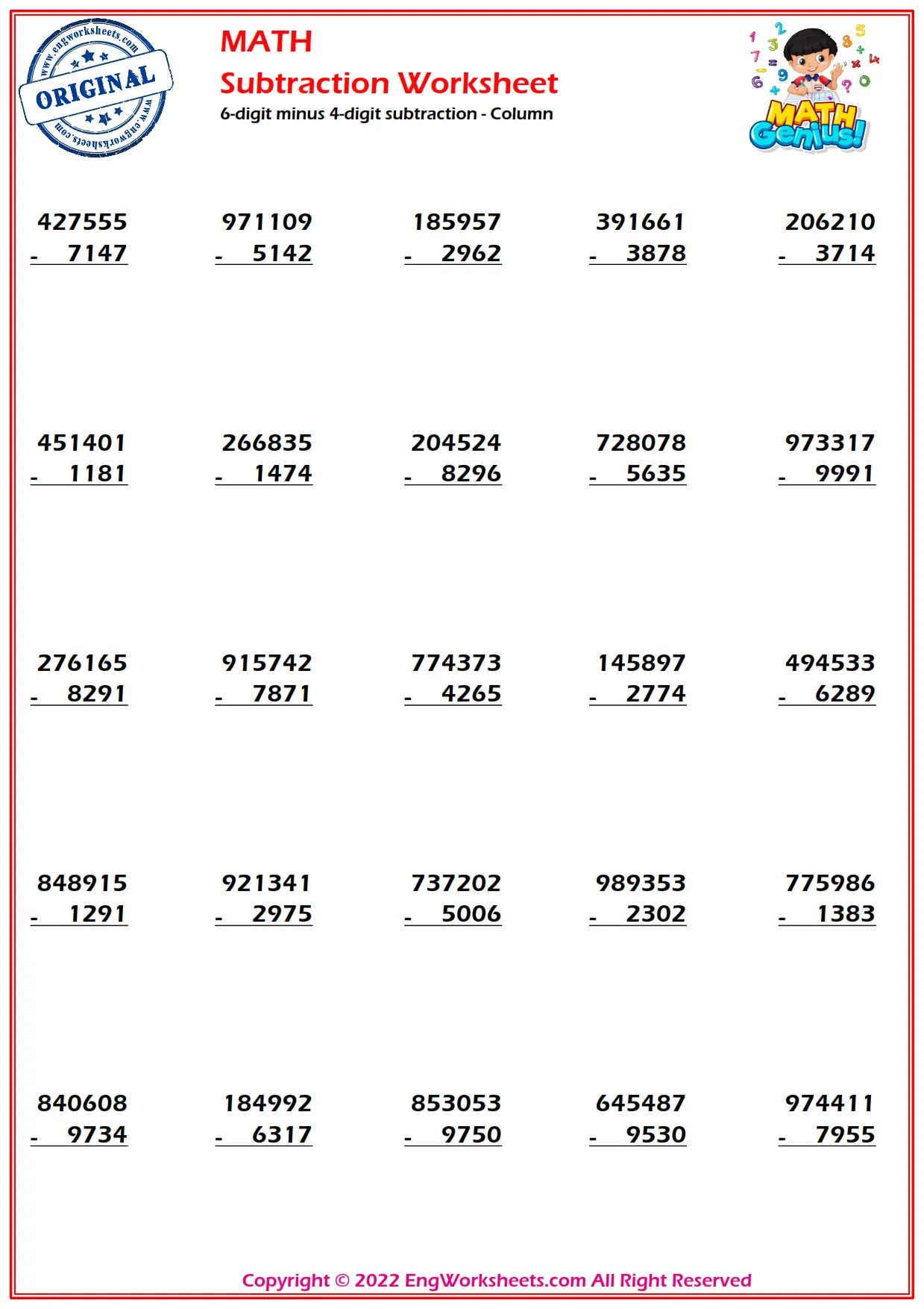 Strengthen subtraction skills with our free printable column subtraction worksheets, which challenge students to find the difference between 6-digit and 4-digit numbers. Regrouping skills are a must for these problems.