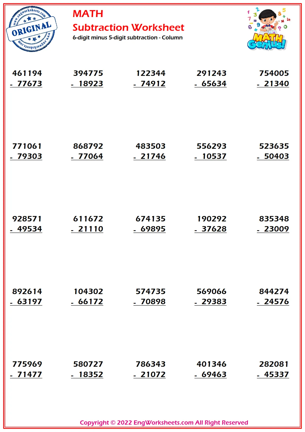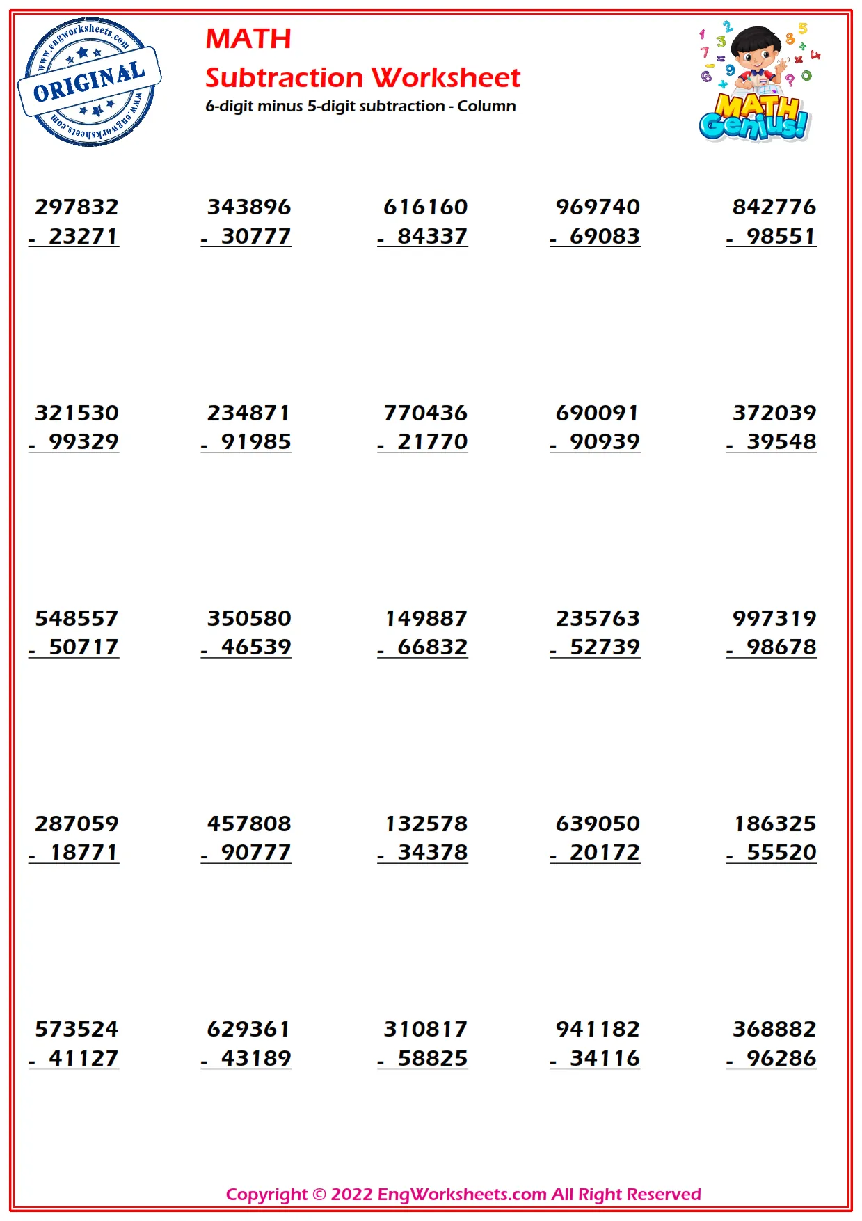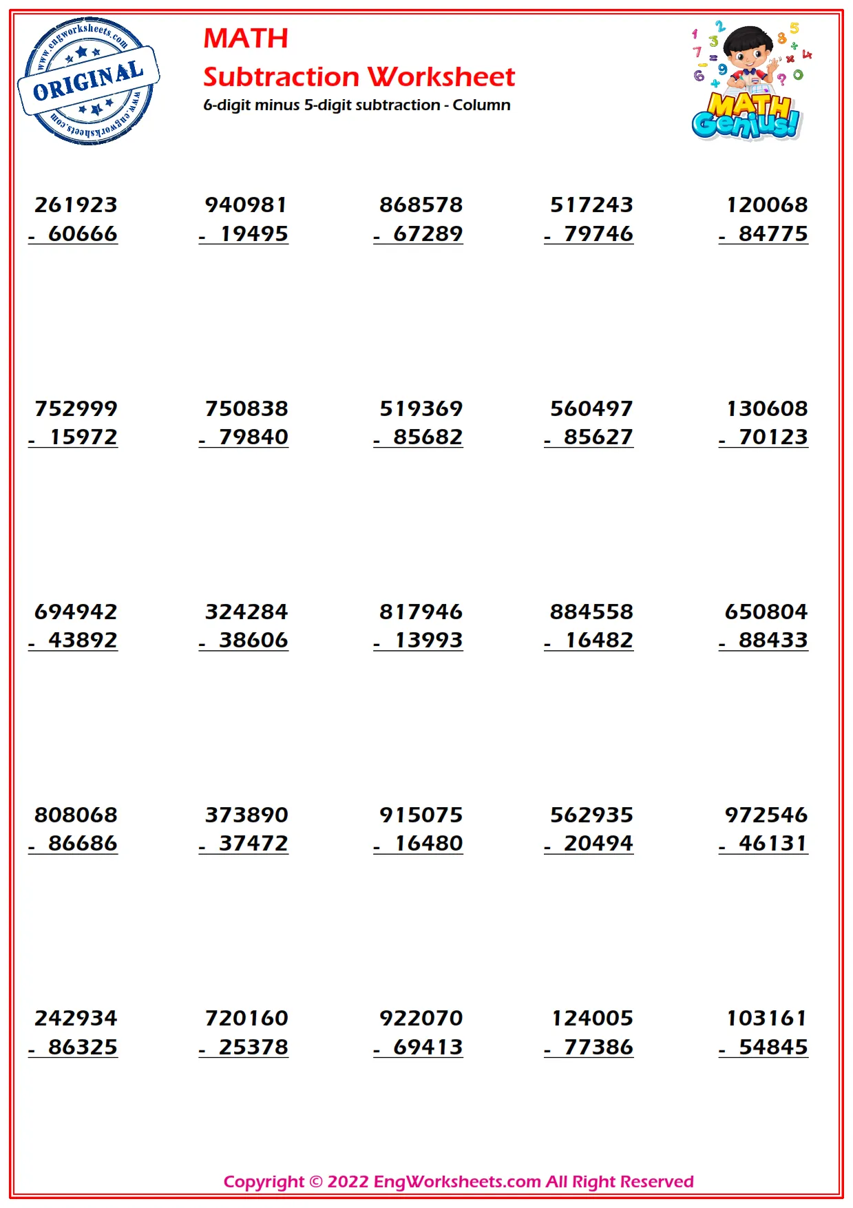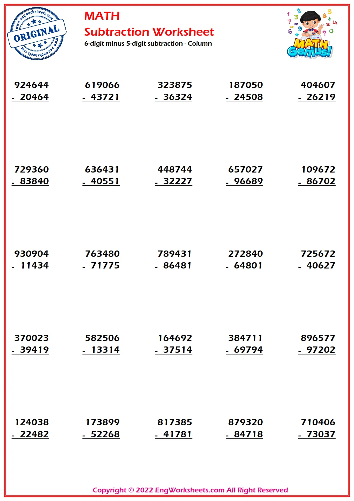 Reward learners with our challenging subtraction problems, which require subtracting 5-digit numbers from 6-digit numbers. Use our answer keys to verify your work and track your progress.