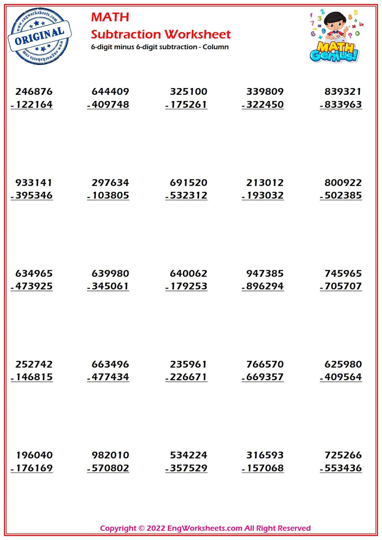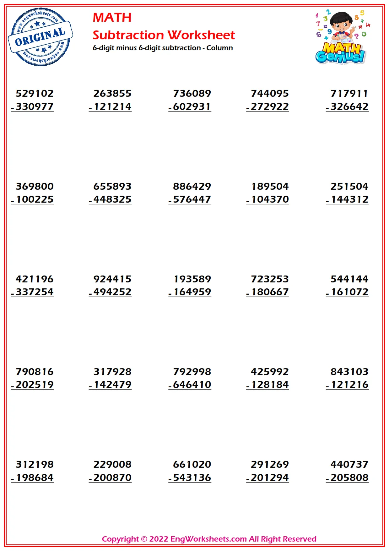 Practice 6-digit minus 6-digit subtraction with ease using our column subtraction worksheets. These worksheets are perfect for students who need to develop their subtraction skills and gain confidence in handling large numbers.