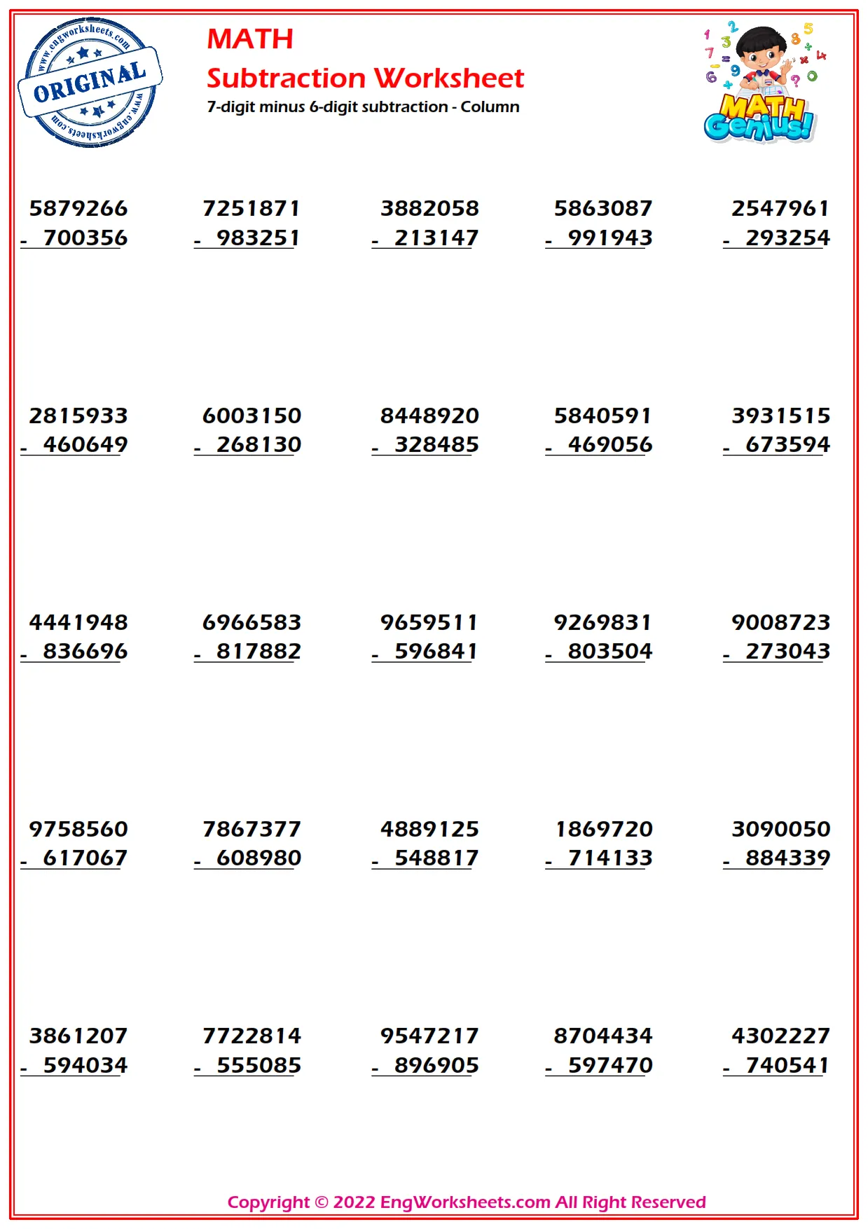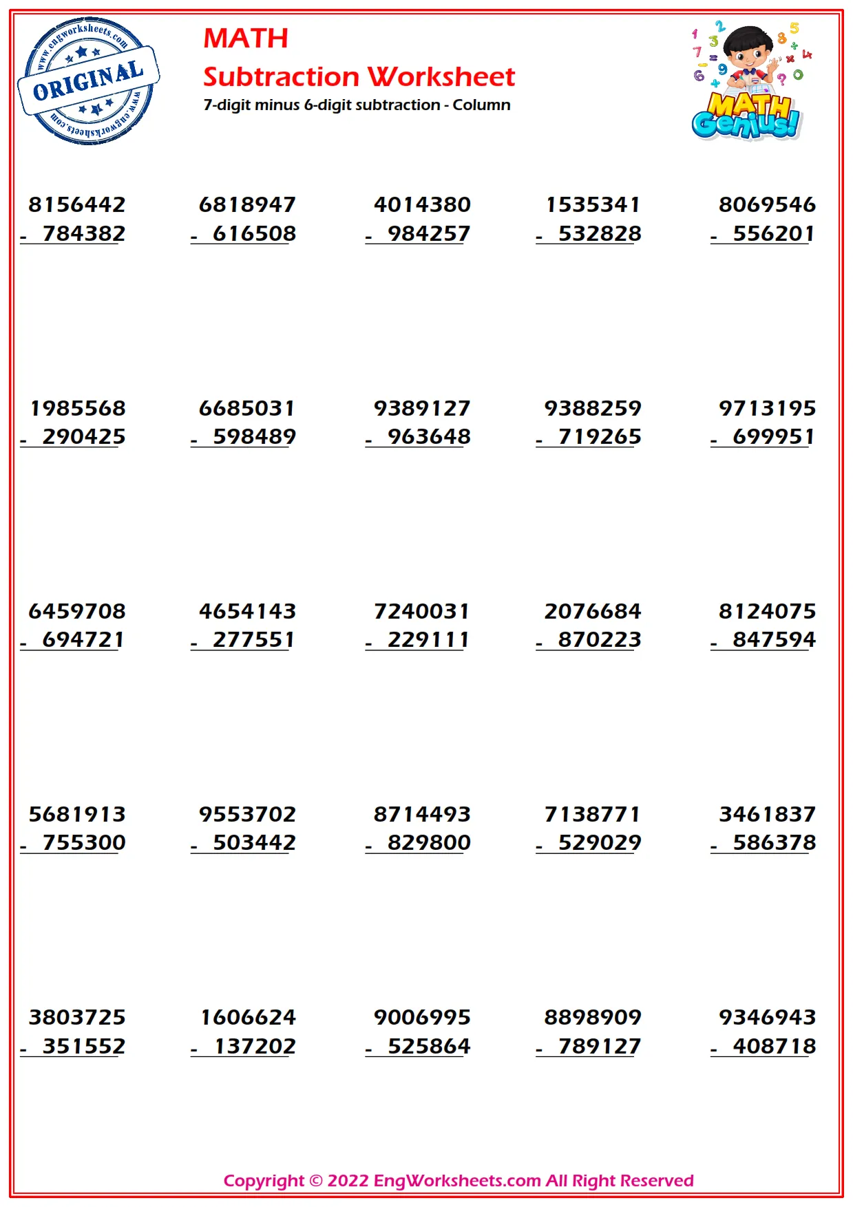Help your students master 7-digit minus 6-digit subtraction with our column subtraction worksheets. These worksheets offer a variety of problems to challenge students and reinforce their subtraction skills.