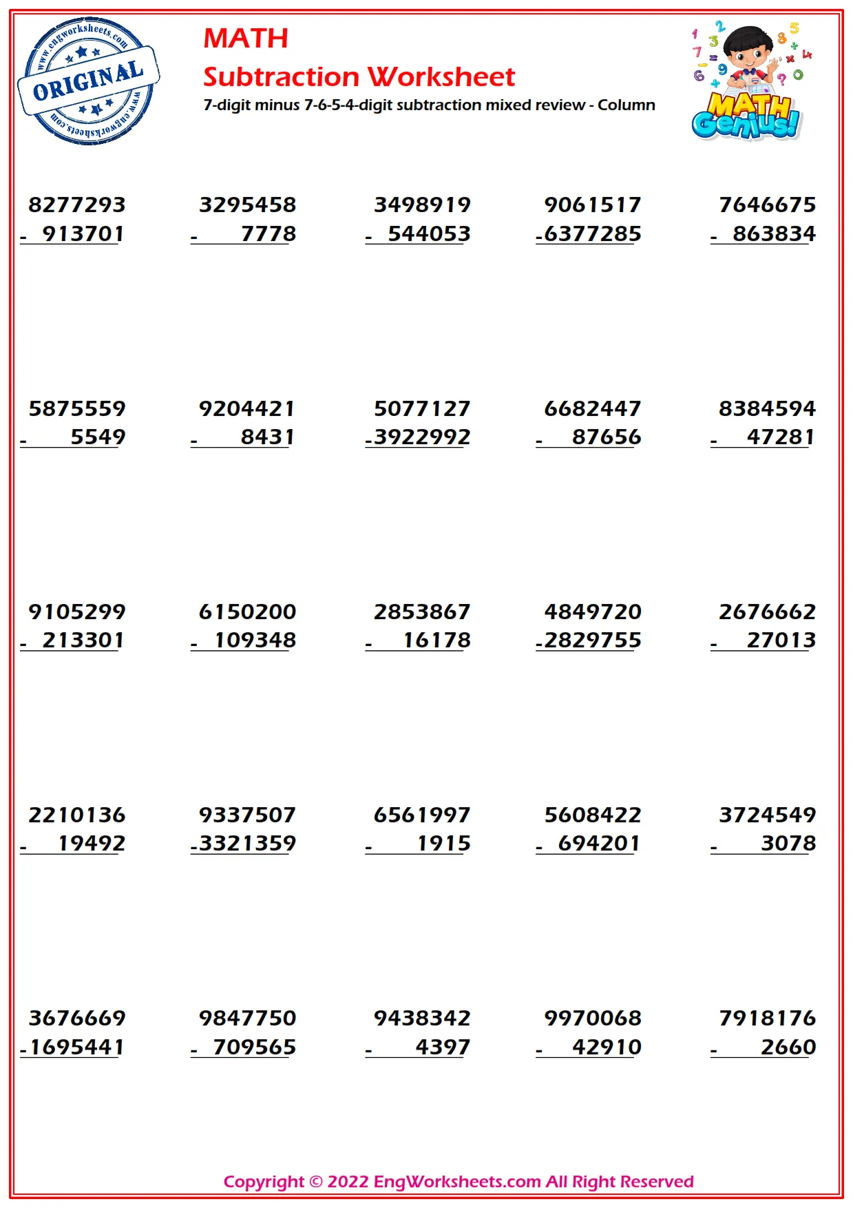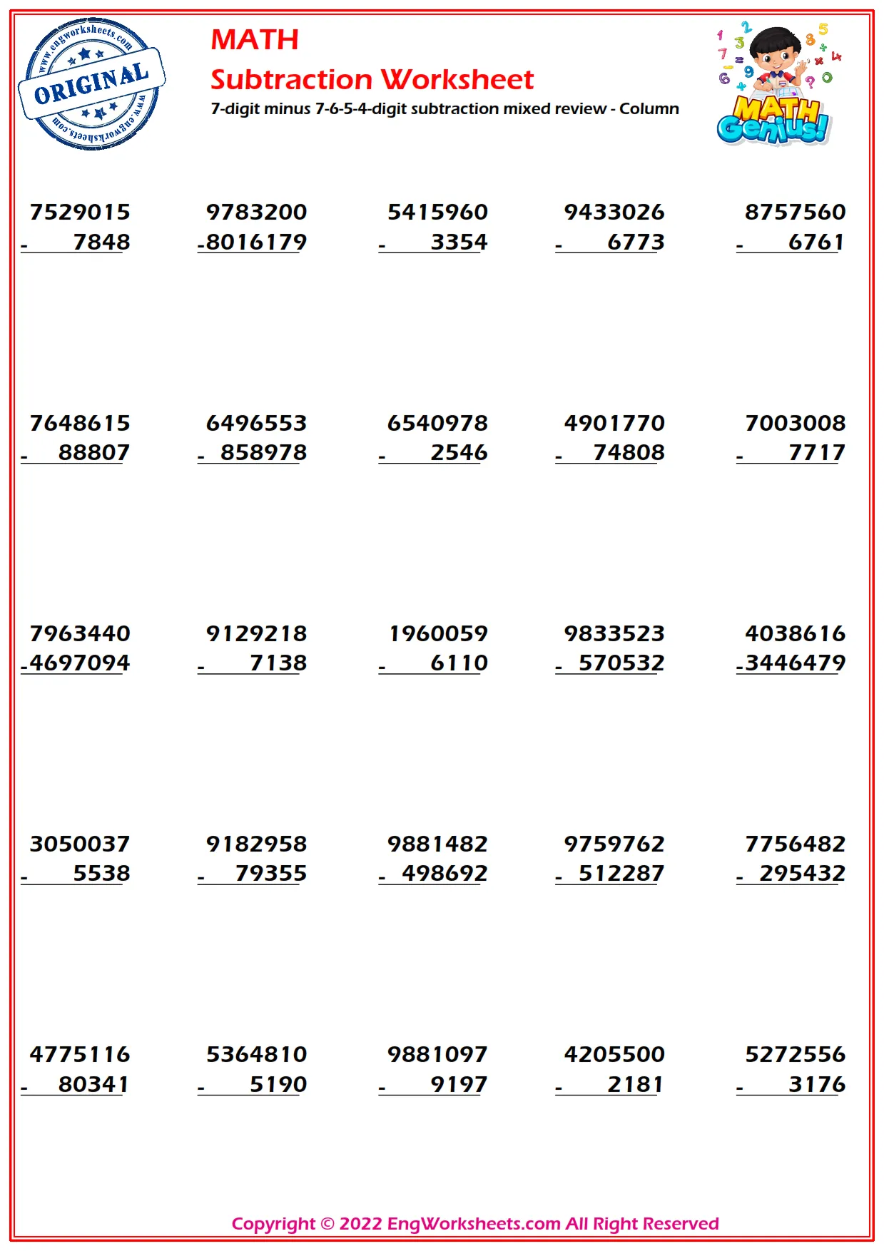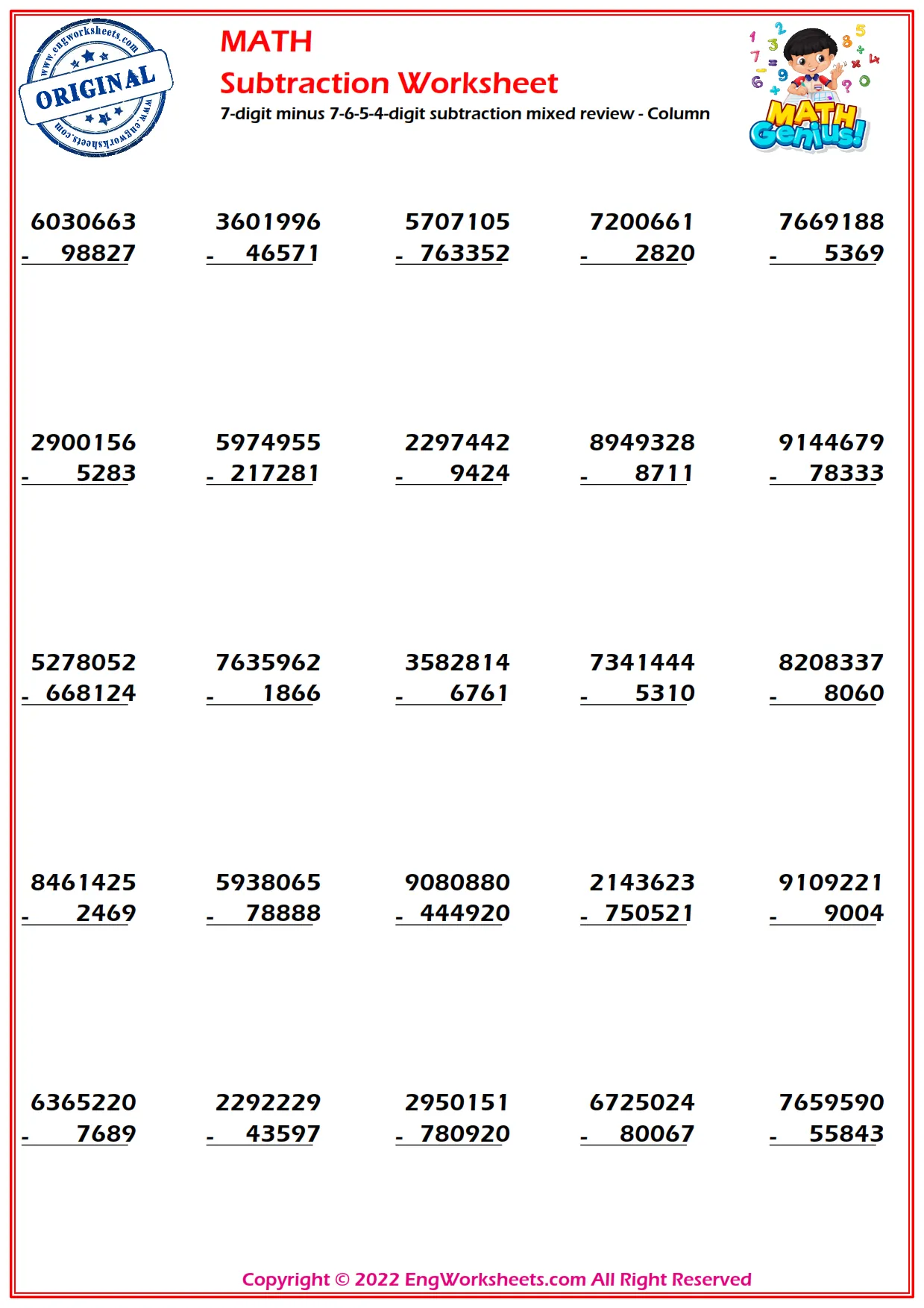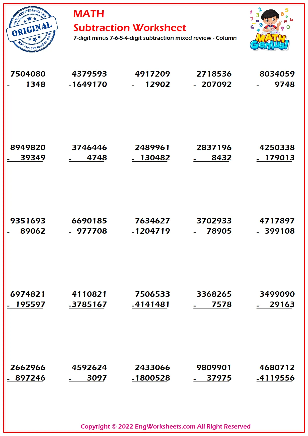 Our 7-digit minus 7-6-5-4-digit mixed review subtraction worksheets offer a variety of challenging problems to help your students develop their subtraction skills. These column subtraction worksheets are perfect for reinforcing subtraction skills and improving accuracy.