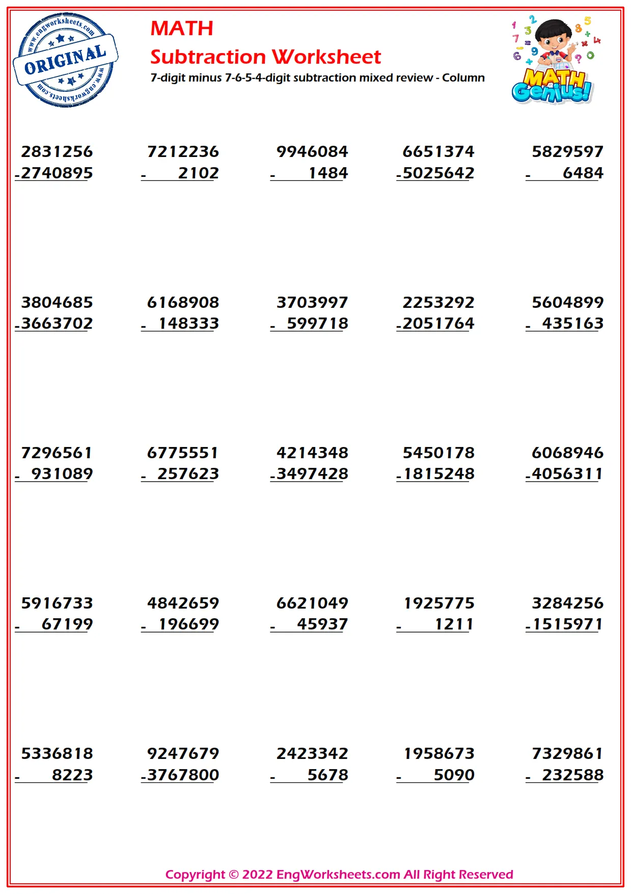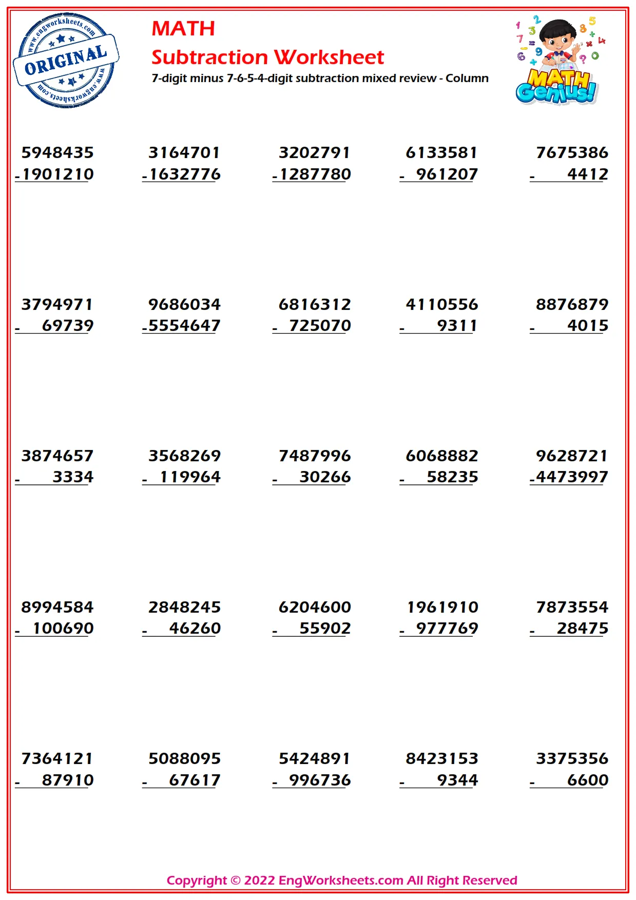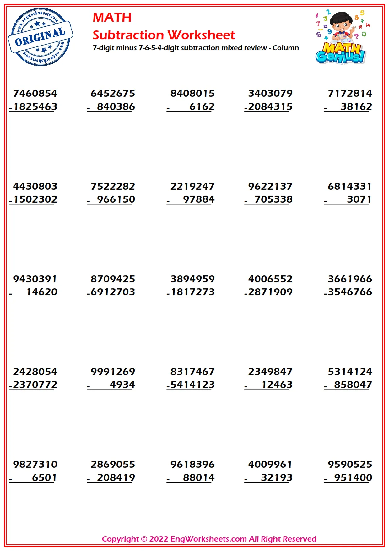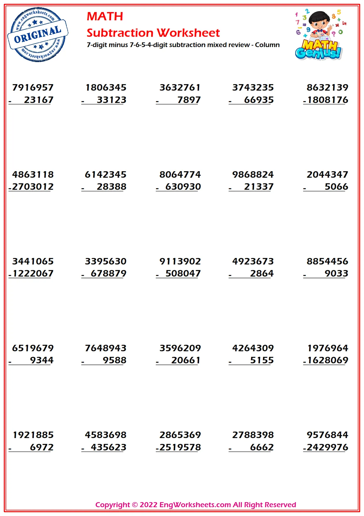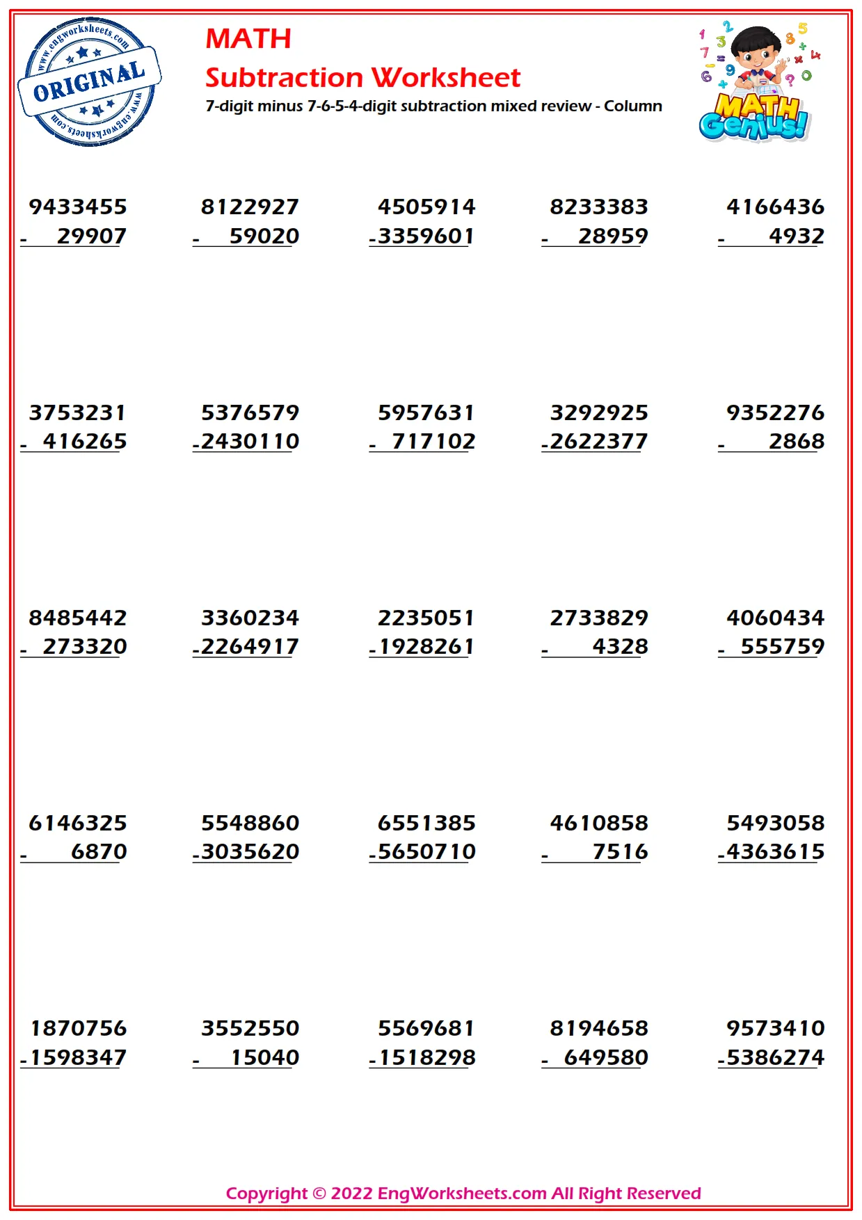 Our 7-digit minus 7-6-5-4-digit mixed review subtraction worksheets offer a variety of challenging problems to help your students develop their subtraction skills. These column subtraction worksheets are perfect for reinforcing subtraction skills and improving accuracy.