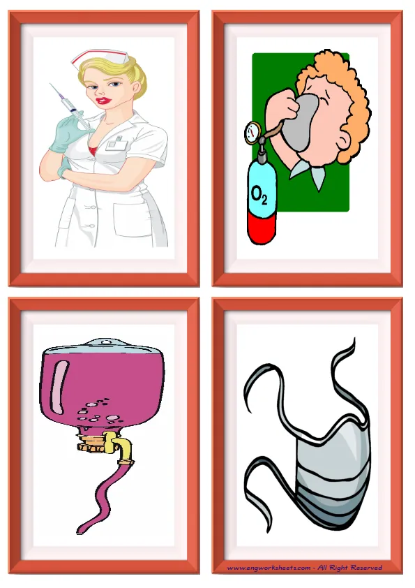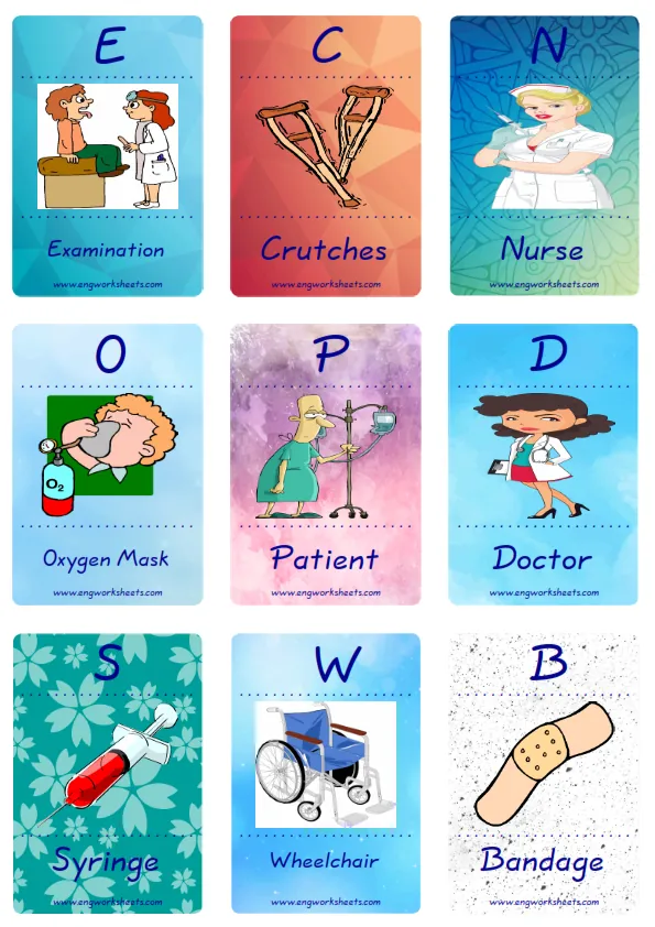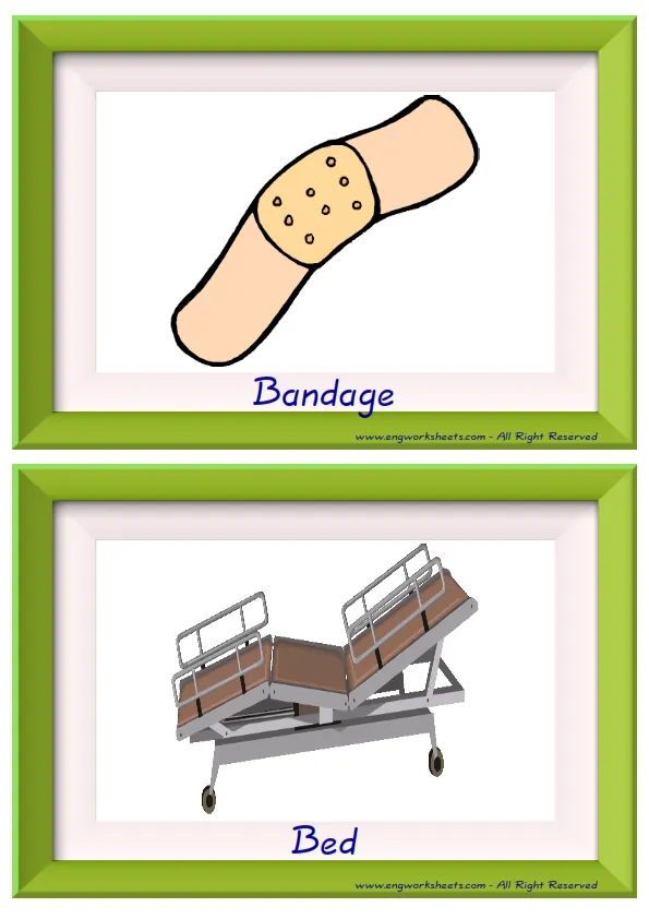 English equivalent is given below the pictures and pictures on our Hospital English vocabulary worksheet for kids. On this worksheet you will learn the words and pictures you will come across on all of our Hospital English worksheets. You have to match words and pictures on our Hospital worksheet and learn the words. You can print our printable Hospital English worksheets and distribute them to your students.