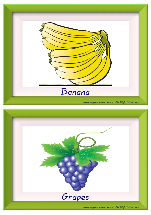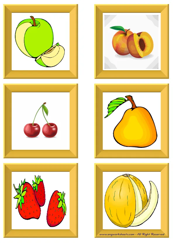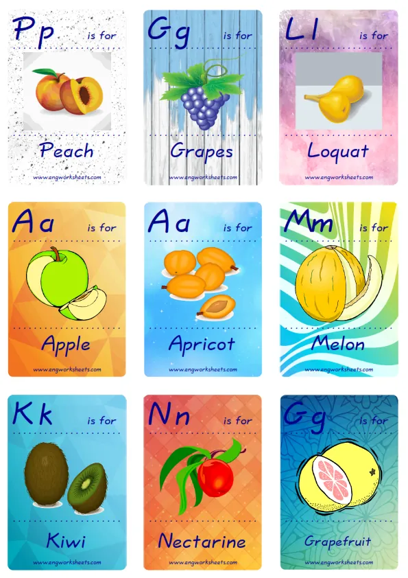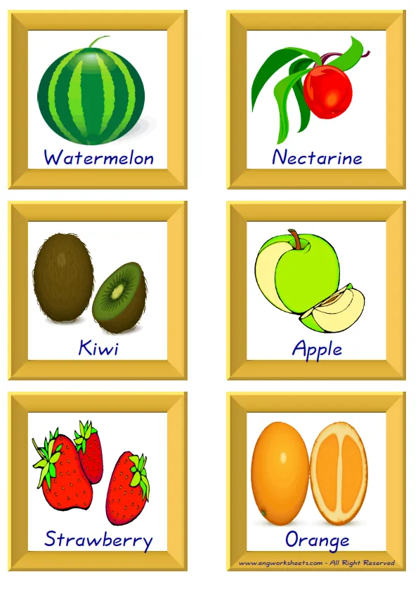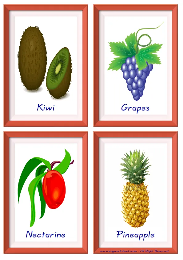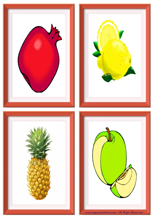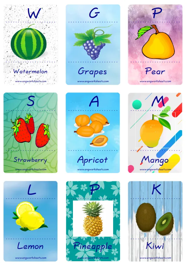 Flashcard of Fruits pictures supplied with words, with nine pictures on a page. You can print our worksheet prepared using Fruits pictures in different sizes and use it for remembering in your classroom or at home. Using thick paper, you can use it with your friends to carry it in your pocket or purse at all times or to play games in the classroom. Thus, learning will become much more fun.