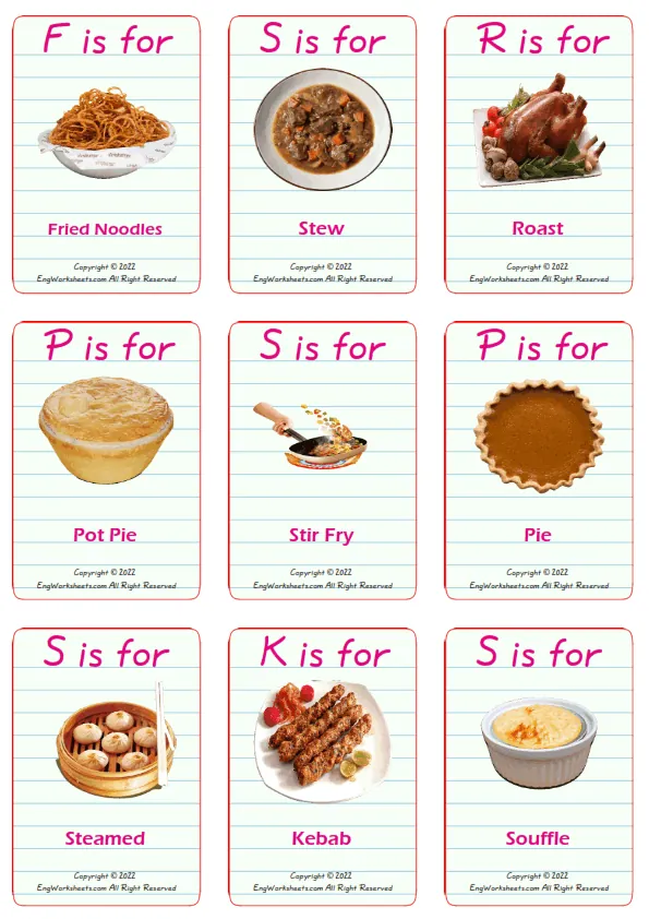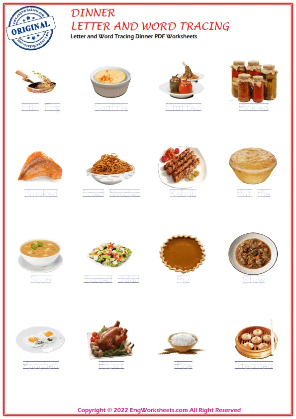 On our Dinner English vocabulary worksheet for kids, the pictures describing the words and the meaning in English and your own language are given below the pictures. On our worksheet, you will learn the English equivalent of Dinner words in your own language. Not every word of the word for the Dinner is given in your language. This section is still in the trial phase. You can let us know the missing words. Our Dinner English worksheets are provided in PDF. You can print it out, give it to your students, or even hang it on a clipboard in your classroom.