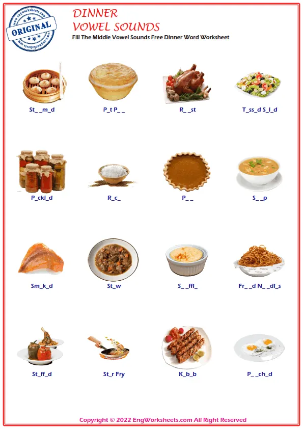 Fill The Middle Vowel Sounds Free Dinner Word Worksheet