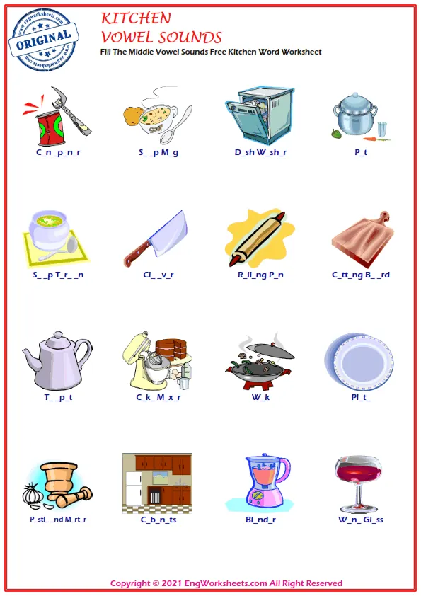 Fill The Middle Vowel Sounds Free Kitchen Word Worksheet