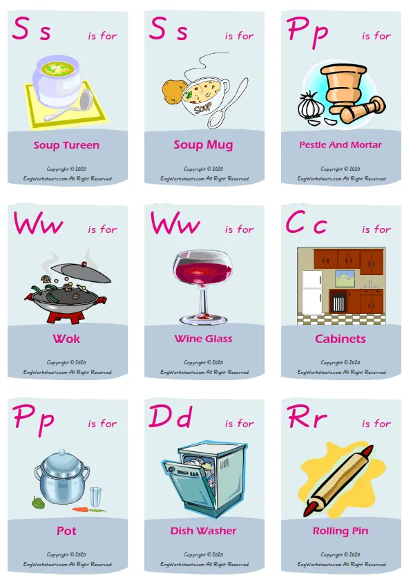 Wordless Kitchen vocabulary worksheet with nine images per page