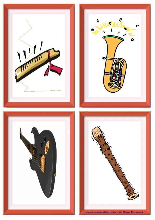 Half-page wordless Musical Instruments English vocabulary pictures flashcard. You can print our worksheet prepared using Musical Instruments pictures in A5, A4, or A3 size and use it for recall in your classroom or at home.