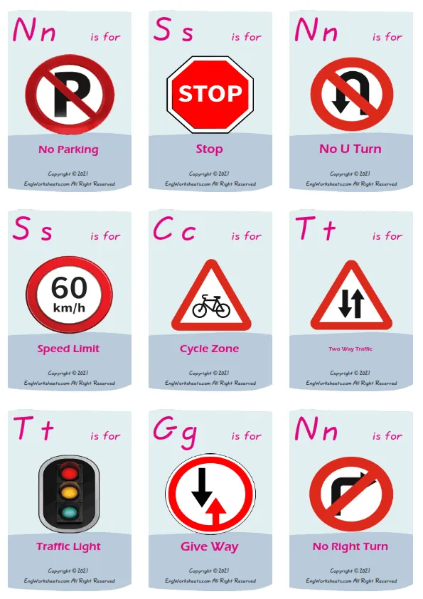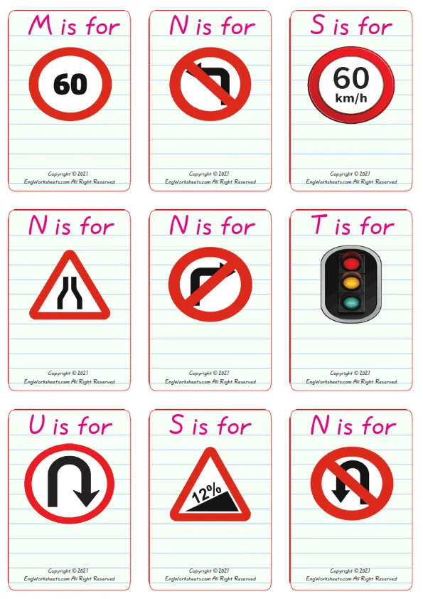 Wordless Road Signs vocabulary worksheet with nine images per page
