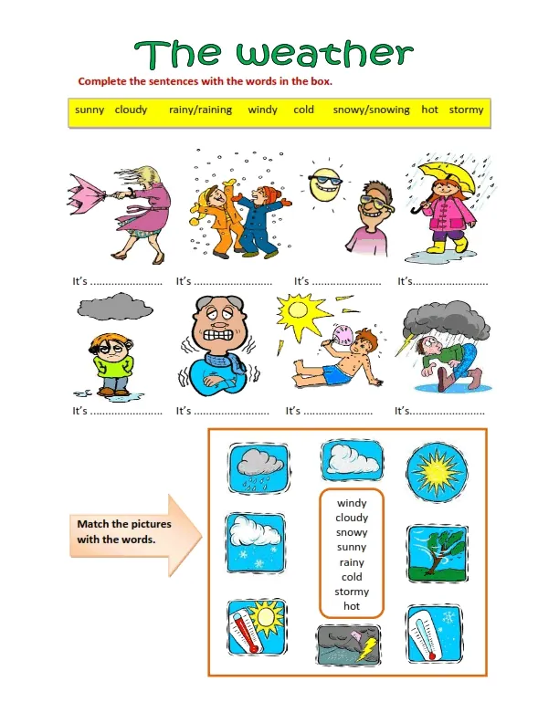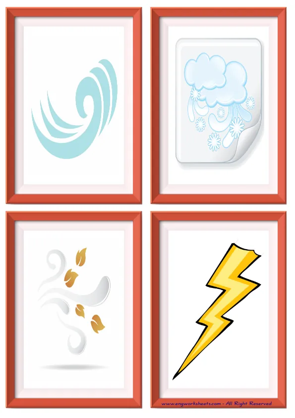 The words to be written under the pictures on our Weather printable English worksheet are given in bulk at the top of our worksheet for kids. Write the words under the correct pictures, you can check what you wrote in the answer keys. On our Weather vocabulary worksheet, you will understand how much you have learned the words and pictures you match in your memory.