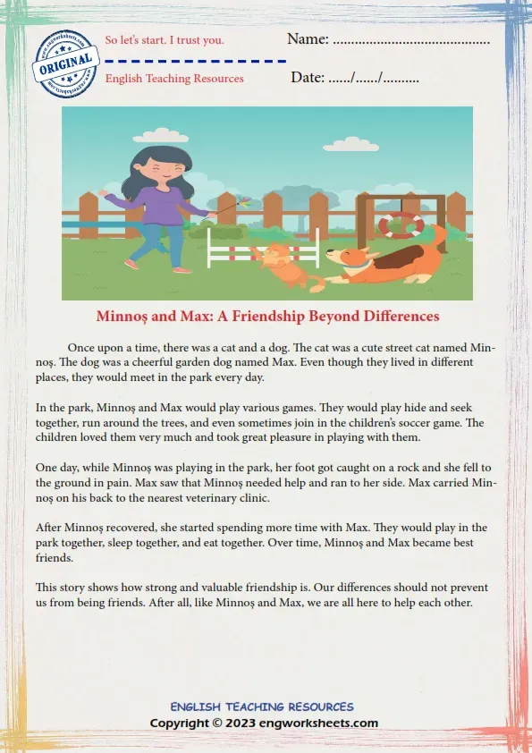 Minnos And Max Is A Heartwarming Story Of Friendship Between A Street Cat And A Garden Dog. They Met In The Park Every Day, Where They Played Games And Had Fun. One Day, Minnos Was Hurt, But Max Helped Her Get To The Vet. After That, They Becaame Closer Than Ever. This Story Teaches Us That Friendship Can Overcome Differences And That We Should Always Be Kind To Each Other. If You Want To Learn More About This Story Or Improve Your English Skills, You Can Visit Engworksheets.com. This Website Offers Free Printable Worksheets For Grammar, Vocabulary, Flashcards, Fairy Tales, And More. You Can Also Find Fun Games, Tests, Puzzles, And Quizzes To Practice Your English. Engworksheets.com Is A Great Resource For Kids And Teachers Who Want To Learn English In A Fun And Effective Way. Reading Comprehension Worksheet Grade 3, Vocabulary, Reading Comprehension Vocabulary, Reading Comprehension For Kids, Reading Comprehension Exercises, Reading Comprehension For Grade 3, Reading Comprehension Test, Free Reading Comprehension Worksheets, Reading Comprehension Worksheets Pdf With Answers. Reading Comprehension Doctor Text Worksheets, Reading Comprehension Middle School, Reading Comprehension Elementary, English Esl Reading Comprehension Worksheets Grade 3
