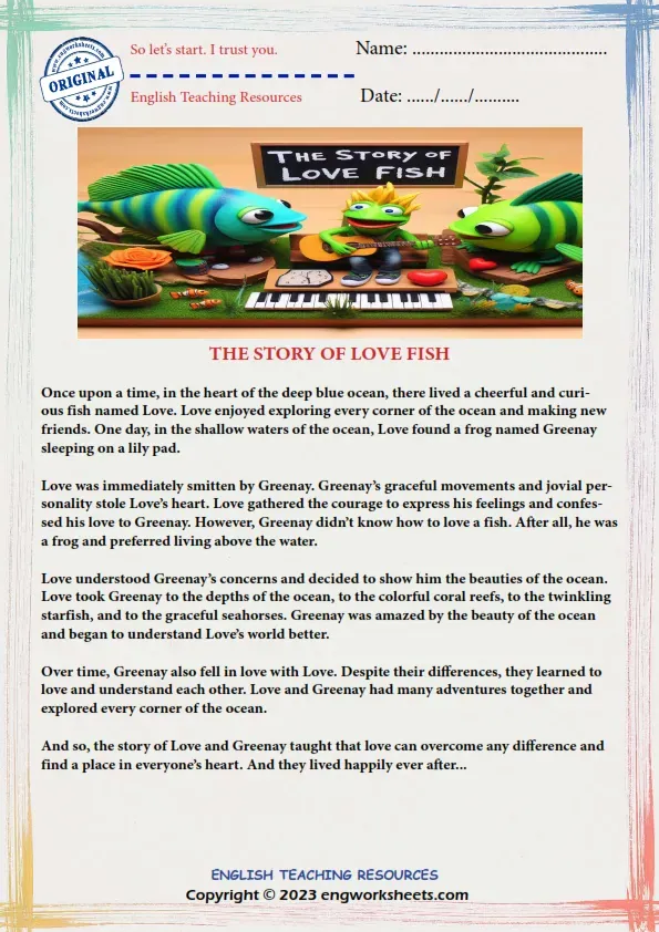 Dive Into Reading With “The Story Of The Love Fish†Welcome To A New Adventure In Reading Comprehension With Engworksheets.com! Today We Dive Into The Depths Of The Ocean With A Fascinating Tale Called "the Story Of The Love Fish". Perfect For 4Th Graders, This Story Explores Themes Of Friendship, Understanding, And The Power Of Love. The Story Of The Love Fish Introduces Us To Love, A Cheerful And Curious Fish Who Enjoys Exploring Every Corner Of The Ocean. Love's Life Becomes Exciting When She Meets Greenay, A Frog With A Cheerful Personality And Graceful Movements. Despite Their Differences, Love And Greenay Embark On A Journey Of Understanding And Mutual Respect That Proves That Love Can Overcome Any Obstacle. At Engworksheets.com, We Believe In The Power Of Stories To Spark The Imagination And Foster A Love Of Reading. “The Story Of The Love Fish†Is Just One Of The Many Resources We Offer To Help Students Improve Their Reading Skills. So Dive In And Discover The Wonders Of The Deep Blue Ocean With Love And Greenay! Remember, Reading Comprehension Isn't Just About Understanding The Words On The Page, It's About Connecting With The Characters And Being Immersed In Their World. Good Reading! Reading Comprehension Worksheet Grade 4, Vocabulary, Reading Comprehension Vocabulary, Reading Comprehension For Kids, Reading Comprehension Exercises, Reading Comprehension For Grade 4, Reading Comprehension Test, Free Reading Comprehension Worksheets, Reading Comprehension Worksheets Pdf With Answers. Reading Comprehension Doctor Text Worksheets, Reading Comprehension Middle School, Reading Comprehension Elementary, English Esl Reading Comprehension Worksheets Grade 4