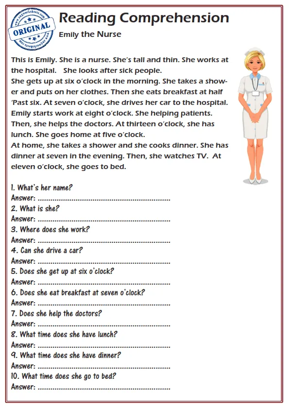 Improve your child's reading comprehension skills with our engaging "Emily the Nurse" worksheets. Each worksheet features a fun and informative story about Emily, a nurse who helps people in need. With comprehension questions that test your child's understanding of the story, these worksheets are perfect for children learning to read or struggling with comprehension. Download and print our "Emily the Nurse" worksheets today to help your child develop their reading skills while having fun!