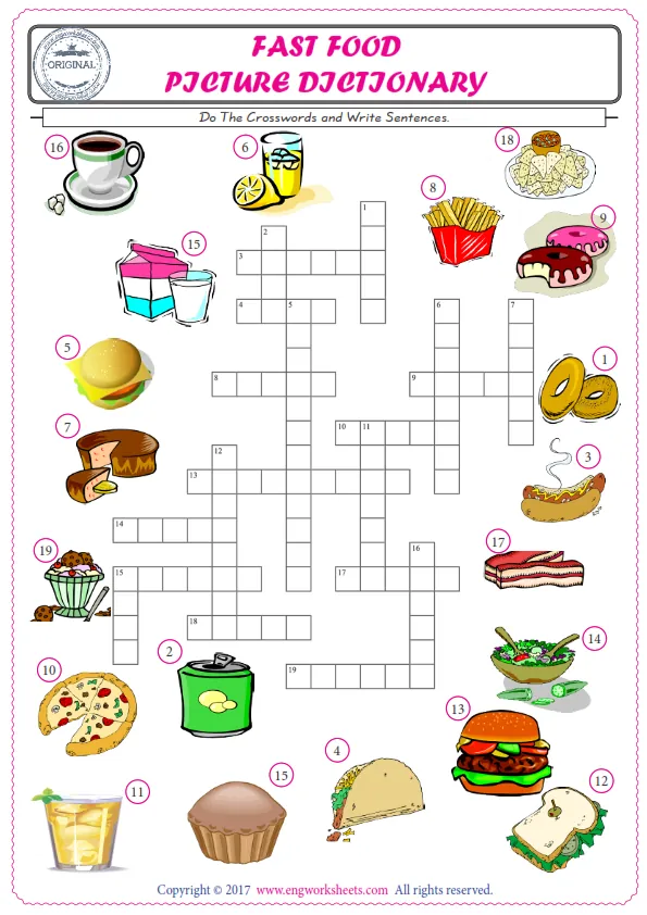 For kids and teachers, ESL printable crossword worksheets in order to study and practice the Fast Food vocabulary. Solve the words given in the crossword and supply them in the crossword . Check the picture and the numbers on them and supply your solution into the crossword . Our worksheets are fun for learning and reviewing the Fast Food words.