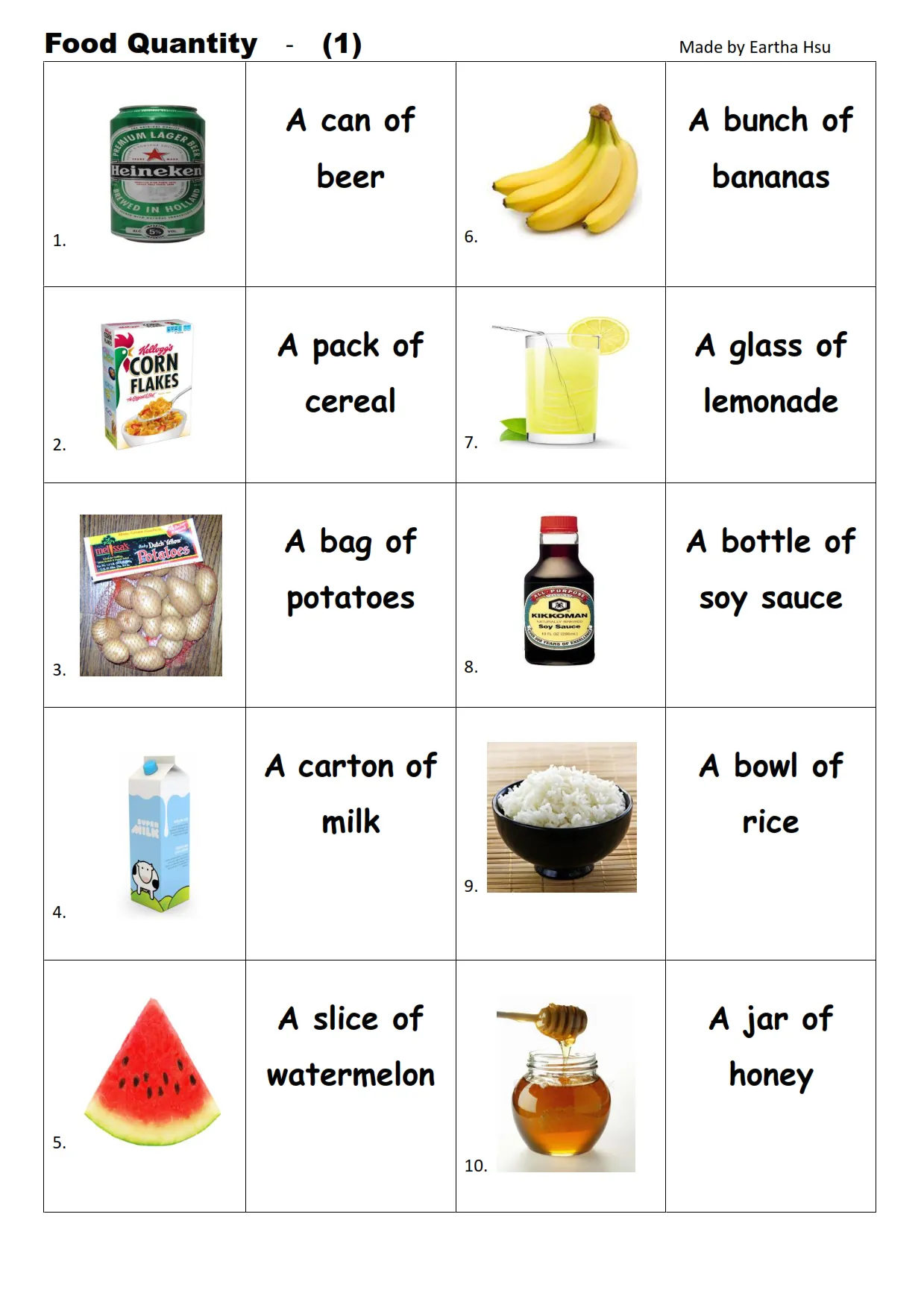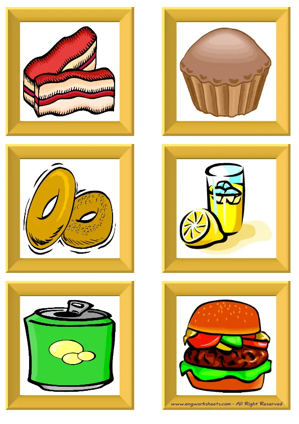Fun Fast Food Flashcards -without words- to let you constantly remember and repeat the words by using the picture you have accustomed to during the phase of learning the words. Check the picture; guess, remember and learn the word. It makes learning permanent by being in sight permanently. For long-term use in your classroom or home, you can print them out on A4 and A3 paper and laminate them if you want. Six image on a page.