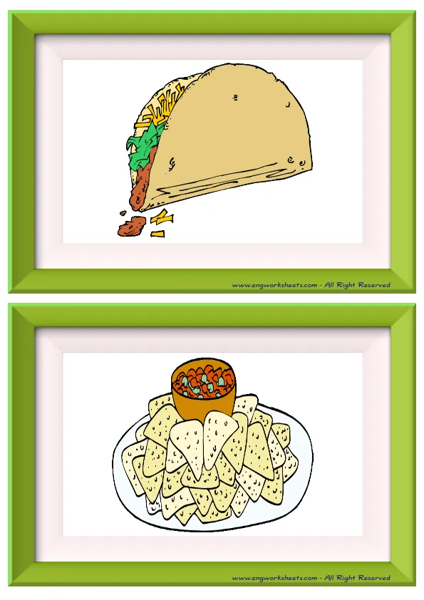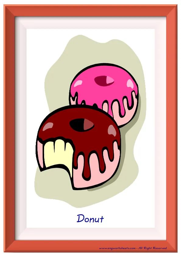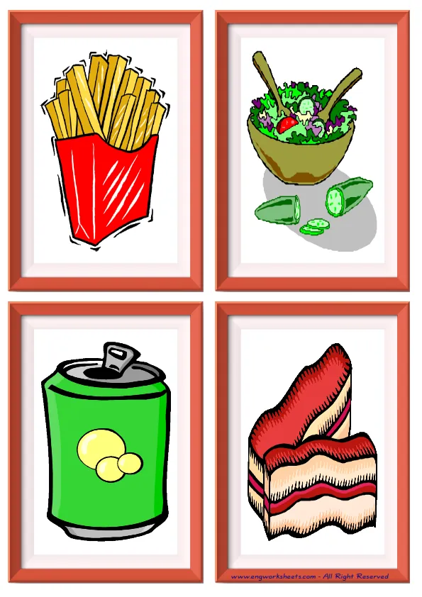 Fun full page Fast Food Flashcards -without words- to let you constantly remember and repeat the words by using the picture you have accustomed to during the phase of learning the words. Check the picture; guess, remember and learn the word. It makes learning permanent by being in sight permanently. For long-term use in your classroom or home, you can print them out on A4 and A3 paper and laminate them if you want.