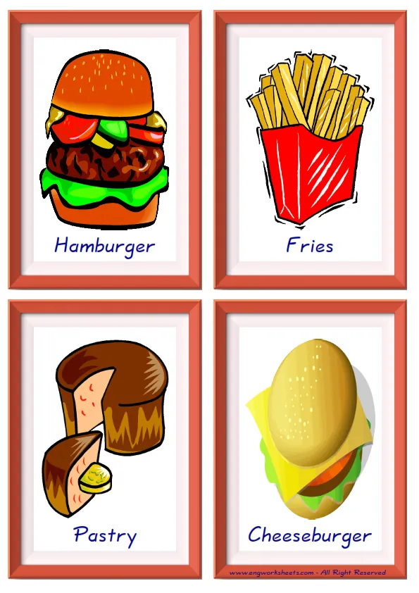 Fun Quarter page Fast Food Flashcards -without words- to let you constantly remember and repeat the words by using the picture you have accustomed to during the phase of learning the words. Check the picture; guess, remember and learn the word. It makes learning permanent by being in sight permanently. For long-term use in your classroom or home, you can print them out on A4 and A3 paper and laminate them if you want. Four image on a page.