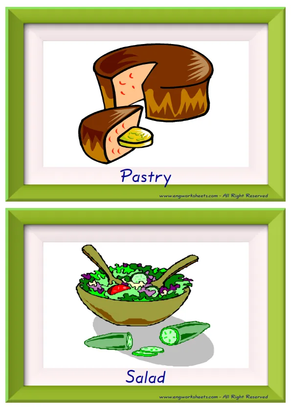Fun half page Fast Food Flashcards -without words- to let you constantly remember and repeat the words by using the picture you have accustomed to during the phase of learning the words. Check the picture; guess, remember and learn the word. It makes learning permanent by being in sight permanently. For long-term use in your classroom or home, you can print them out on A4 and A3 paper and laminate them if you want. Two image on a page.
